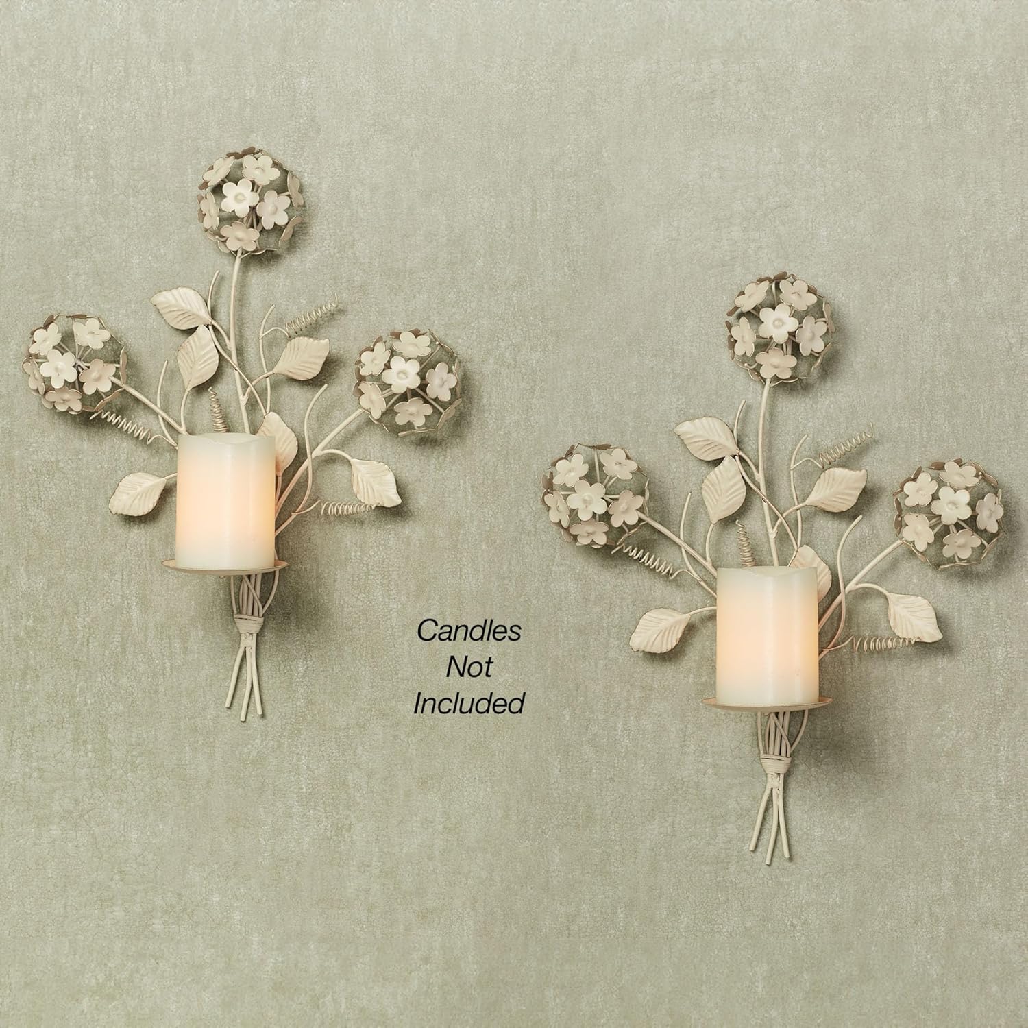 Delicate pom-like clusters create the beautiful look of Hydrangea blossoms. Handcrafted of metal, this wall sconce pair features blooms and leaves. The creamy gold powder-coat finish has stunning handpainted accents. Hinged candlecups will hold your 3" dia. candles. Each floral wall sconce measures 14"Wx5.5"Dx18.5"H.