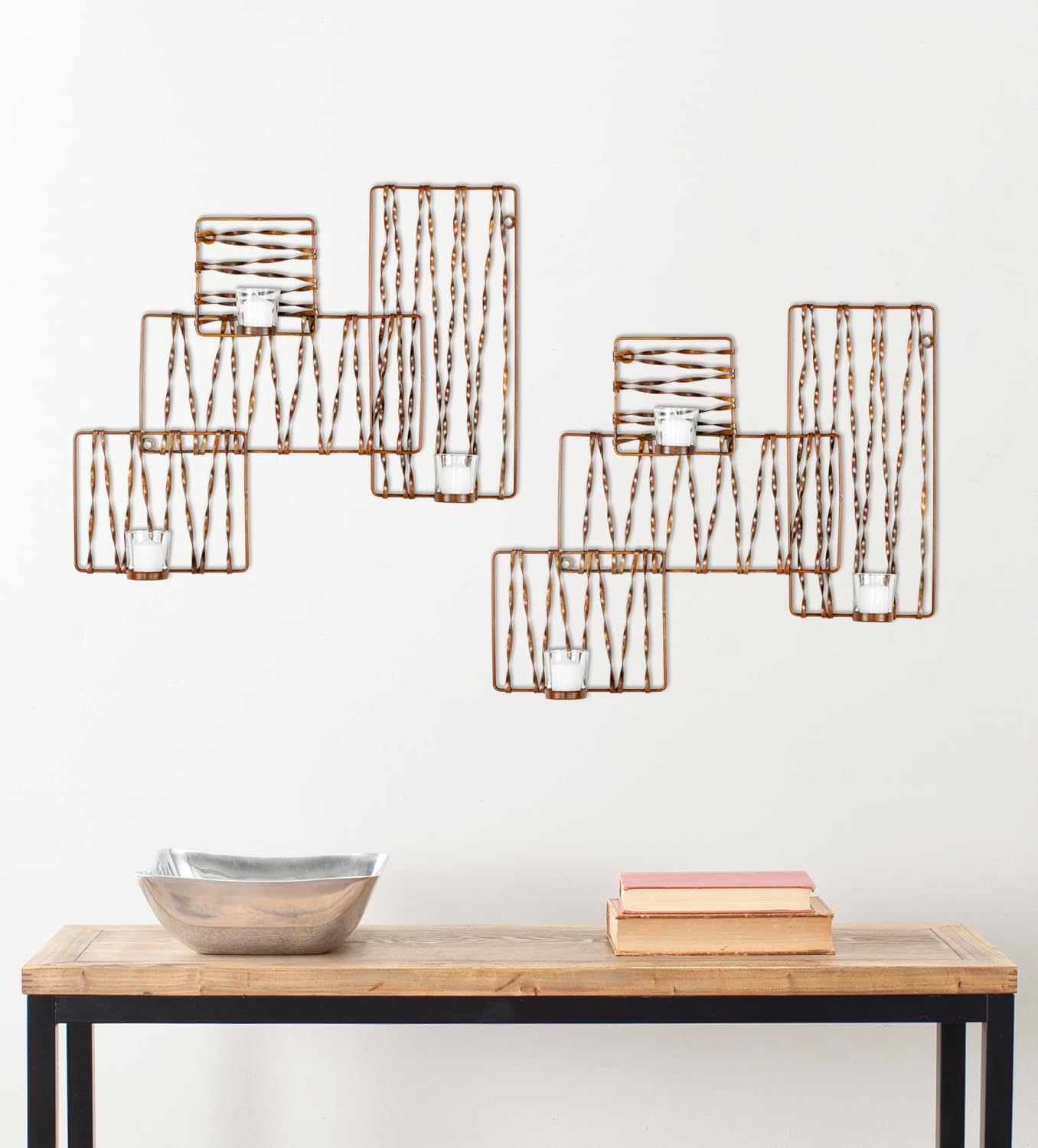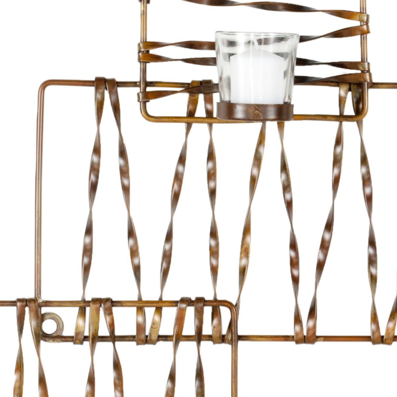Add a stunning accent to your home with the Safavieh Wall Art Collection Art Deco Zig-Zag Candle Holder Wall Sconce. A classic zig-zag pattern inspired this art deco wrought-iron pillar wall sconce. Three shallow candle cups and a copper finish will cast a romantic flicker. This wall sconce works perfectly as a standalone piece, or give a personal touch with multiple units to fill your wall. Beautifully crafted from iron and glass, this easy-to-hang decorative accessory will look great in any room. This sconce measures 23.2 inches high by 20.5 inches wide by 3.54 inches deep.