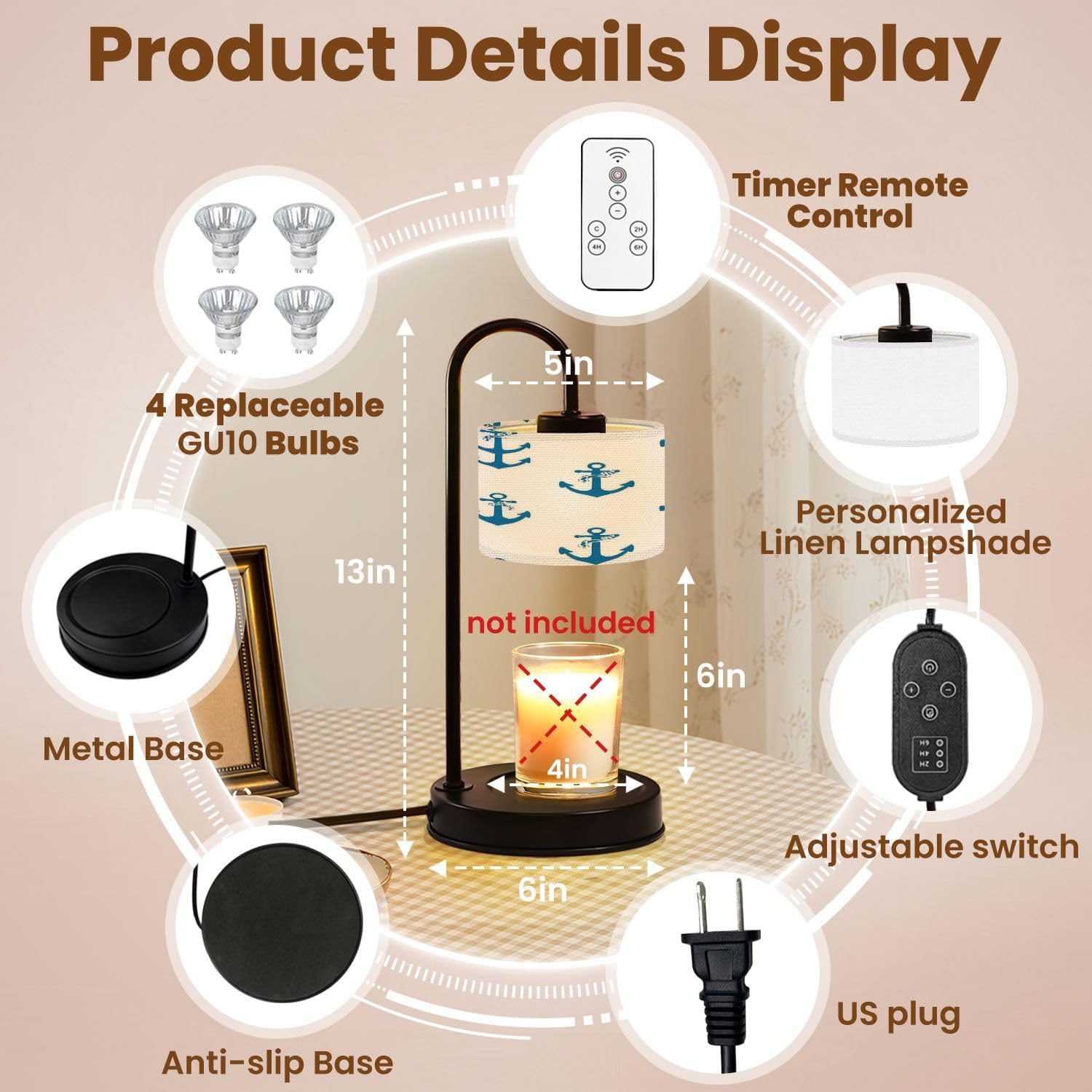Thank you for stopping by. Allow me to introduce a product that can give your room a fresh, new look - the modern candle warmer lamp!Product highlight:<1>Remote Control: Adjust brightness and timer settings effortlessly - no need to get up after night<2>Timer and Dimmer: Set 2H/4H/6H Auto-Off with 4-level Adjustable Brightness<3>Flameless Design: A safe and practical choice for homes with kids, seniors, or pets<4>Keep Pattern Fresh: New trend & holiday designs added monthlyVarious style patterns:Modern, boho, industrial, mid-century, marble, holiday, tropical, leopard print, pink bow, and so onThoughtful tips:<1>Due to variations in monitor color reproduction and lighting conditions (natural light, warm light, white light, etc.), the actual product color may differ slightly from the images shown<2>Due to different measuring tools, the size may have an error of about 1 inch<3>If you have any questions about the lamp, please let us know