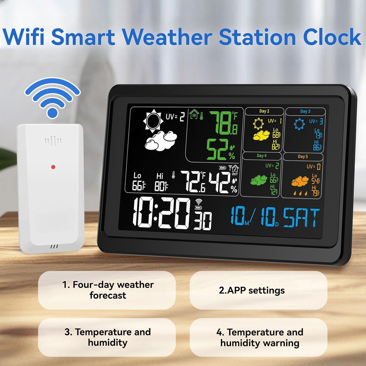 FeaturesAll-in-One Core Functions: WiFi-connected data sync, 4-digit , calendar, weekday display, indoor/outdoor temp/humidity/barometer, 5-day weather forecast (29 weather conditions), and comfort level indicator.Multi- & Data : Supports up to 3 wireless outdoor (1 included) for 3 locations’ data; records /min temp/humidity, with historical data accessible via APP.3 -Up Alerts with 3 modes (Weekday/Weekend/All-Day); APP supports separate weekday settings. Indoor/outdoor temp/humidity alerts (local/APP configurable).Easy & Customization: Top-mounted 6 buttons (Mode/Channel/Alert/+/-/Snooze/Light); 12/24HR and ℃/℉ switchable (local & APP settings), no complicated setup.Convenient Features: USB charging port for continuous use; snooze and backlight function via dedicated button, ideal for home daily use.Specifications:Indoor / outdoor temperature and humidity: Indoor temperature14.18℉122℉( -9.9°C ~50°C ), display LL.L when below 14.18℉/ -9.9℃ and display HH.H when higher than 122℉/ 50°C. Outdoor temperature-58℉158℉( -50°C ~ 70°C), display LL.L when below -50°C /-40℉ and display HH.H when higher than 158℉/70°C. Indoor and outdoor humidity : 1%-99% Power Supply: Main Unit: 3 x AAA batteries (not included) or USB power cableOutdoor : 2 x AAA batteries (not included)SizeWeather Clock20.4x12.5x2.3cmOutdoor 9.4x5x2cm Package Contents:1* WiFi Weather Clock1* USB Power Cable1* Outdoor1* Multilingual Instruction Manual