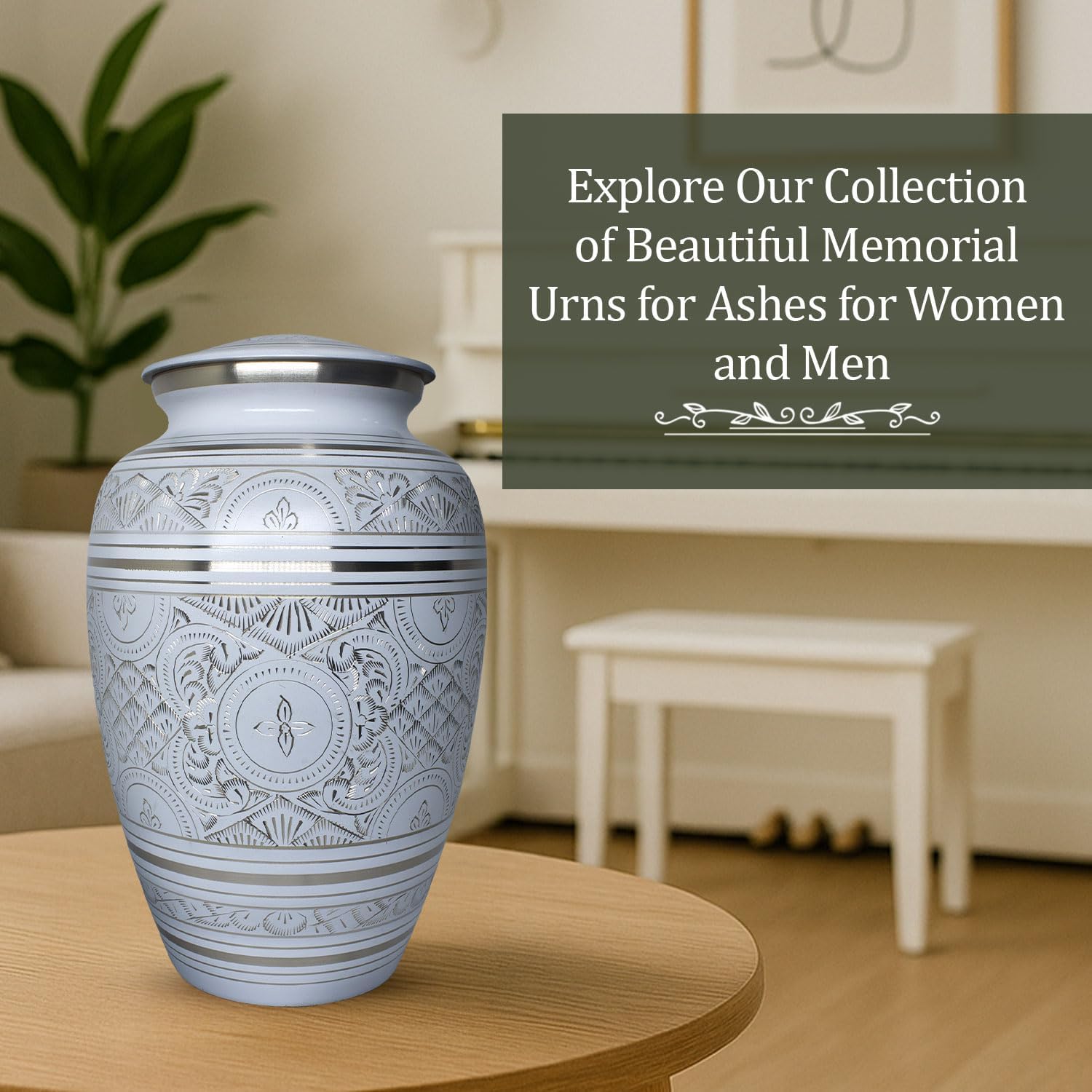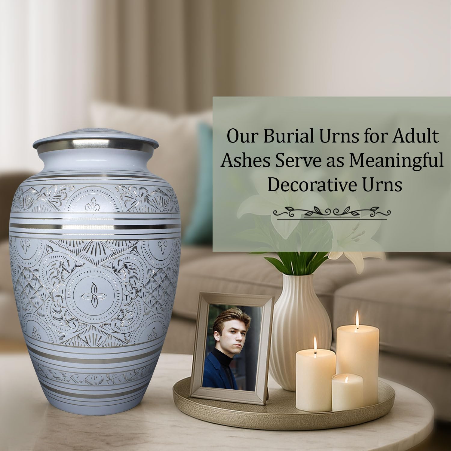 Solace Forever White Cremation Urns for Human Ashes Adult MaleLosing someone close is never easy, and finding the right way to honor their life is deeply important. This white urn offers families a dignified and timeless resting place. Designed with love and care, it serves as a beautiful urn for ashes for women, urn for mom, or urn for men — providing comfort and remembrance during the hardest times.What You Will ReceiveEach purchase includes one large cremation urns for human ashes packed securely in a premium black velvet bag for safe storage and transportation. This funeral urn is thoughtfully handcrafted, making it both durable and elegant for display at home, in a niche, or during memorial services.Elegant & Secure DesignThis handcrafted urn for ashes adult male and urns for human ashes adult female features a protective lacquer coating to preserve its color and finish. A threaded screw-top lid ensures the ashes remain safe, while a felt-lined base provides stability and prevents scratches. It blends seamlessly with any décor, offering a peaceful memorial display.Handcrafted with CareOur artisans create each white urns for human ashes adult man using traditional sand-casting methods. Every detail, from the engravings to the polished finish, is made by hand — making each urn for ashes for women and men unique. This attention to detail ensures your loved one’s memory is honored with dignity.Large Capacity & VersatilityThis funeral urn holds up to 200 cubic inches of remains, suitable for an adult weighing up to 200 lbs before cremation. Whether you need an urn for mom, a father, or another cherished family member, it is designed to offer lasting peace of mind.Why Choose Solace Forever?We know how meaningful this choice is for you. That’s why every cremation urns for human ashes is made with love, compassion, and quality craftsmanship. If you are not fully satisfied with your purchase, we offer hassle-free returns and exchanges — because honoring your loved one should come with peace, not worry.