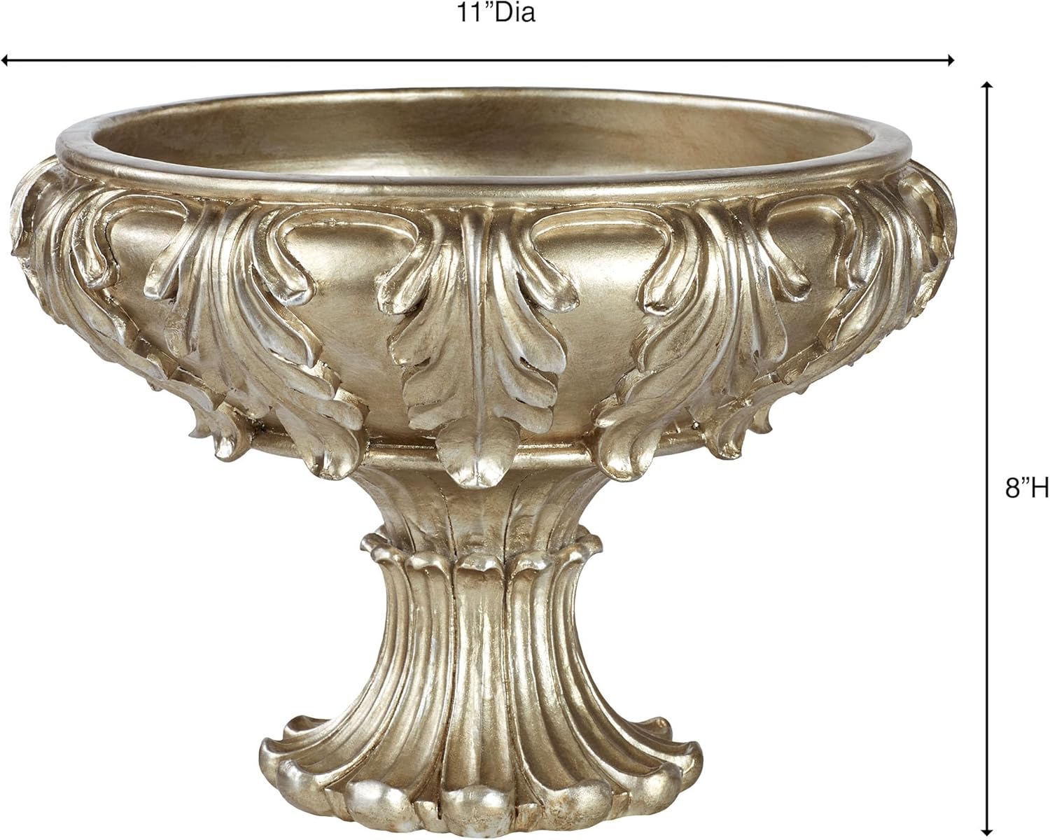 Traditional grandeur details the resin Acassia Platinum Centerpiece Bowl. Perfect for your table, the decorative centerpiece bowl features a unique flaring, fluted base and acanthus leaf embellishments. Add a touch of timeless elegance to your home decorating with classical decor elements featured on the pedestal bowl. Accent is ideal for tabletop displays, mantelpieces, or as a unique gift. Use as a stylish centerpiece for seasonal accents or orbs (not included). Decorative use only. Accent measures 11"dia.x8"H.