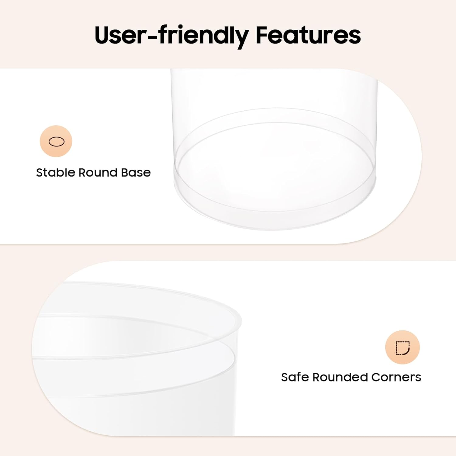 DescriptionTailored for wedding celebrations, our high-grade wedding display stand is more than just a tool—it’s a way to elevate your day with elegance and romance. Constructed from top-tier clear material, its simple yet sophisticated design complements every wedding style. From wedding certificates and photo prints to floral arrangements and decorative pieces, it showcases your items beautifully, creating a memorable visual experience.Key FeaturesVersatile Usage: Serving beautifully as decor, it shines not just as a display piece for wedding reception tables, but also adds charm to all kinds of events. Beyond that, it works equally well as a display table in commercial spaces like store windows and exhibition halls, adapting to both personal and professional needs.Easy Assembly: Its simple structure helps you finish the installation quickly and use it in a short time.Effortless Cleaning: It has a smooth surface and an open structure, so you only need to wipe the dust or residue with a towel.Ideal Gift: With good performance and a modern appearance, it can be used as an ideal housewarming or festival gift for parents, friends, and lovers.Good Customer Service: We aim to provide quality products and services. If you have problems, please feel free to contact us. We will reply and solve the problem for you as soon as possible.DetailsStable Round Base: Its rounded base stops the product from sliding around and keeps it steady.Safe Rounded Corners: They prevent scratches on either your skin or the items you’re displaying, making the product more reliable to use.ApplicationIt can not only be used as party art decor, plant stands, art display stands, or an end table to decorate your living room, but also as a decoration for a wedding, Christmas party or celebration ceremonies.How to Assemble1.Insert the raised part into the grooved seam.2.Place the attached ring into the cylinder at the right place, adjust the height until it can be stable.3.Flip the cylinder over and put the lid on from the other side, making sure the grooved of the lid is aligned with the edge of the cylinder. (2 lids)4.Finish(If you feel it is not firm, you can use glue or tape to reinforce it twice.)SpecificationMaterial: PVC, AcrylicColor: ClearProcess: Injection MoldingStyle: ModernAssembly Required: YesMounting Type: Free StandingNumber of Pieces: 3Product Size: 40*90cm/15.75*35.43in; 36*75cm/14.17*29.52in; 33*60cm/12.99*23.62inPackage Size: 54*15*92cm/21.26*5.91*36.22inMax. Load Capacity: About 35kg/77.16lbsGross Weight: 6.1kg/13.45lbslbsNet Weight: 5.5kg/12.13lbsPackage Included3* Wedding Display Stands