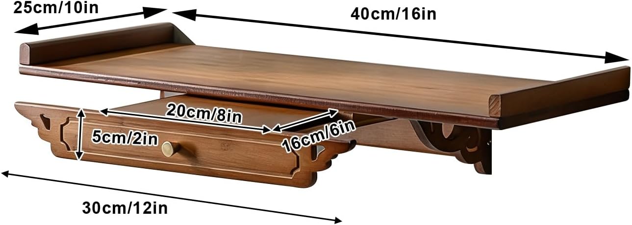 This versatile table serves as a spiritual altar, meditation table, worship table, coffee table, and more. It is ideal for activities such as worshipping statues, praying, offering sacrifices, burning incense, and divination. Constructed from solid wood, it is available in beige and brown colors. The table comes in multiple overall dimensions: 40x25cm (16x10"), 50x25cm (20x10"), and 60x25cm (23.5x10"). It does not require assembly and can be used as a spiritual altar table, meditation table, worship table, small side table, candlestick table, display table, ritual table, portrait pooja table, or prayer table. The package includes one altar shelf (decorations not included) and installation accessories.