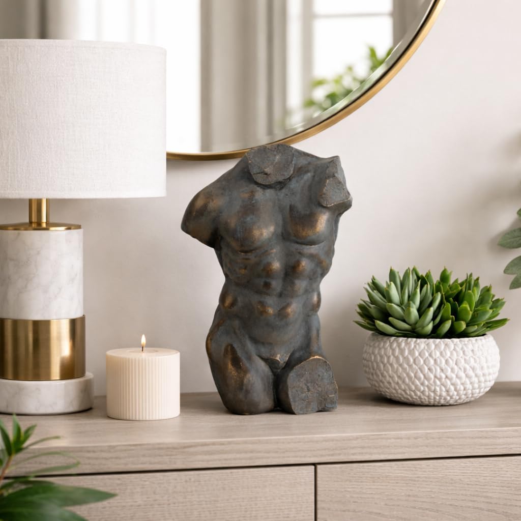 Make a commanding statement in your space with the modern male torso sculpture, a striking decorative object that embodies timeless artistry, refined craftsmanship, and sculptural elegance. Handcrafted from high-quality resin and finished in a rich bronze tone, this expressive piece measures 10" L x 6" W x 16" H, offering a balanced scale that feels substantial while remaining refined. Designed to capture the strength and beauty of the human form, its intricate contours and bold silhouette draw inspiration from both classical sculpture and modern design, creating a powerful visual presence that elevates any interior. Ideal for enhancing home decor accents in the living room, hallway, office, or entryway, this bust adds depth, personality, and artistic impact to curated spaces. The deep metallic finish allows natural light to accentuate every curve and surface detail, pairing effortlessly with decorative books, metallic trays, and gold decor to create a gallery-inspired vignette that feels sophisticated and intentional. Display it on a console, pedestal, or tabletop to transform everyday surfaces into expressive focal points that convey confidence and refined taste. The sculptural form also complements bird decor, statues, orbs, beads, or garland, helping you build a cohesive, designer-level display with layered texture and visual contrast. Each handcrafted piece reveals subtle variations in finish and tone, highlighting artisanal authenticity and ensuring every sculpture feels unique. Perfect for elevating table decorations, console tables, or statement arrangements, it brings visual weight and presence to both minimalist and eclectic interiors. Whether chosen as a thoughtful housewarming or wedding gift or showcased within your own collection of decorative objects, the modern male torso sculpture celebrates art, form, and resilience, transforming your dEcor into a confident expression of culture, creativity, and timeless sophistication.