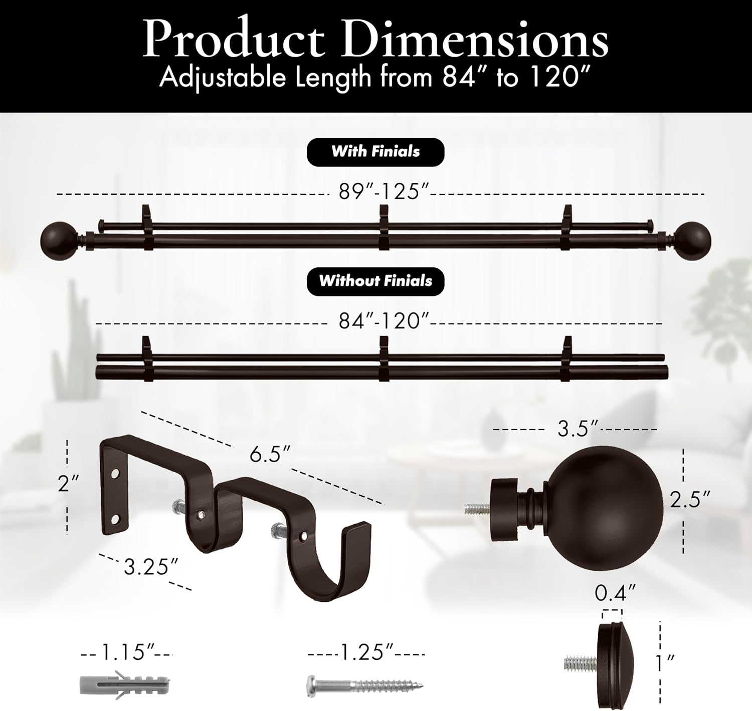 COMPLETE WINDOW DOUBLE ROD SET: Includes 2 metal rods, 2 metal ball finials, 2 end cap finials, 2 double brackets and mounting hardware. STURDY AND DURABLE: 1” diameter front rods, 5/8” diameter back rods and 2” diameter ball finials are made of metal so you know they will last. EXTENDABLE: Designed to fit a range of window sizes. Come in three sizes: 28" - 48", 48" - 84" and 84" - 120". Two double brackets included in 28"-48" rod set; three double brackets included in 48"-84" and 84"-120" rod sets. Projection from wall to back rod is 3 inch, wall to front rod is 6.25 inch. MORE FINISH CHOICES: Available in 5 finishes: Black; Oil-rubbed bronze; Satin nickel, Pewter and Royal Gold.