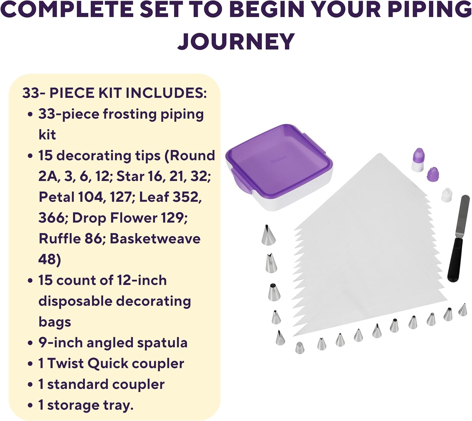 Bring your dessert decorating ideas to life with the Wilton Decorating Essentials Frosting Piping Kit. Designed for bakers of all skill levels, this all-in-one 33-piece set gives you the tools you need to pipe a wide variety of designs using buttercream icing. From simple borders to detailed flowers and textures, this kit makes decorating cakes, cookies, and cupcakes easy and fun.The set includes 15 metal decorating tips in popular shapes and sizes, fifteen 12-inch disposable decorating bags, a 9-inch angled spatula, a Twist Quick coupler, a standard coupler, and a storage tray to keep everything neatly organized. The metal tips and spatula provide durability and control, while the couplers allow you to switch tips quickly as you decorate. Easy to clean and simple to store, the decorating tips and spatula are top-rack dishwasher safe, and the storage tray wipes clean with a damp cloth. Whether you are just starting out or expanding your decorating tools, this essential kit helps you decorate with confidence and creativity. Note: Wilton metal bladed spatulas contain Stainless Steel (Iron, Chromium, Nickel Alloy, Manganese, Copper, Phosphorus). California AB1200 disclosure. Note: Wilton metal decorating tips contain Stainless Steel (Iron, Chromium, Nickel Alloy, Manganese, Copper, Phosphorus). California AB1200 disclosure.