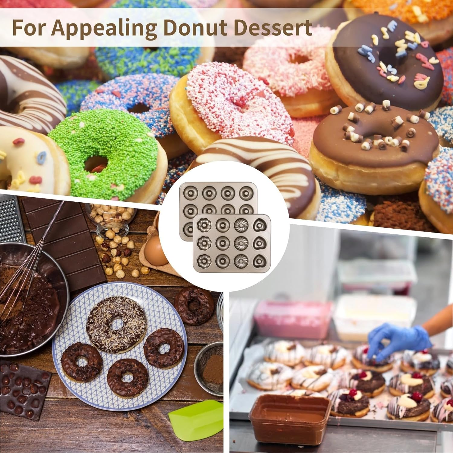 Color: silver Material: Carbon Steel Product size: mold tray : 14.4 x 10.4 x 0.9 inches Package Includes: Donut Mold Cake Pan x 2 Note: - Please refer to the measurement. Tiny measuring error is allowable in normal range. - There might be a little color difference due to the monitor, camera or other factors, please refer to the physical item.