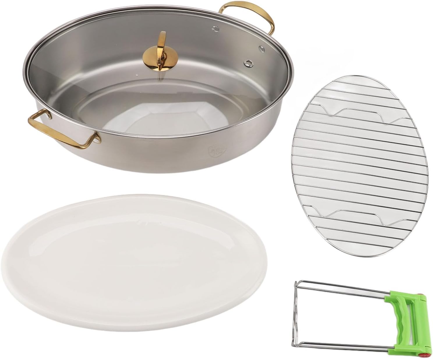 Specification: Item Type: Stainless Steel Fish Cooking Pot Material: 304 stainless steel, ceramic, plastic, glass Weight: approx. 2715.00 g/95.77 oz Steaming pot size: Approx. 38.5 x 11 x 17 cm/15.2 x 4.3 x 6.7 inches. Size of the cooking rack: approx. 33 x 3 cm / 13.0 x 1.2 inches. Plate size: Approx. 36.5 x 3.8 cm/14.3 x 1.5 inches. Packing List: 1 x cooking plate. 1 x cooking pot. 1 x lid 1 x Tray Clamp 1 x cooking rack.