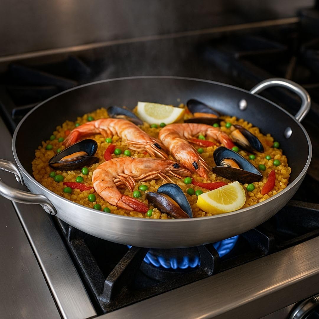 The Soro Essentials – 18” Round Aluminum Nonstick Paella Pan is a spacious and durable cooking pan designed to help you prepare authentic paella and a wide variety of rice-based dishes with ease. Measuring an impressive 18 inches in diameter, this large pan is ideal for cooking generous portions, making it the perfect choice for big family gatherings, parties, catering events, or festive celebrations where sharing food is part of the experience. Its lightweight aluminum construction ensures fast and even heat distribution across the wide cooking surface, allowing your recipes to cook thoroughly and evenly while bringing out rich, balanced flavors. The premium nonstick interior enhances your cooking by allowing ingredients to release easily, ensuring every dish looks as good as it tastes. Cleanup is simple and quick, while the surface also reduces the need for excess oil or butter, giving you the flexibility to create lighter, healthier meals without sacrificing flavor. From traditional Spanish paella to fried rice, pasta dishes, stir-fries, braised meats, or mixed vegetable creations, this pan offers the size and versatility to handle both everyday recipes and special-occasion cooking. The round, shallow design makes mixing and stirring effortless, ensuring even cooking and authentic textures throughout every serving. Built with sturdy dual side handles, the pan is easy to lift, carry, and transport, whether you’re cooking in your home kitchen or taking it outdoors to barbecues, camping trips, festivals, or backyard parties. The large size paired with reliable handles makes serving directly from the pan convenient and impressive, creating a beautiful presentation centerpiece for your guests. Its generous capacity allows you to prepare meals for groups with ease, transforming cooking into a social, enjoyable experience. Crafted for consistent performance and long-lasting use, the Soro Essentials 18” Paella Pan is designed for compatibility with a variety of stovetops and outdoor cooking setups. The aluminum body combines lightweight practicality with dependable durability, while the nonstick finish adds convenience and efficiency to every cooking task. With its large capacity, ease of use, and versatility, this pan becomes an essential tool for any cook who enjoys preparing meals for gatherings and celebrations. Whether you’re recreating authentic Spanish dishes, experimenting with new flavors, or enjoying casual outdoor meals with loved ones, this 18” paella pan is built to deliver excellent results, impressive servings, and memorable dining experiences every time. Measures 18” x 18” x 2.25” Round Aluminum Nonstick Paella Pan.