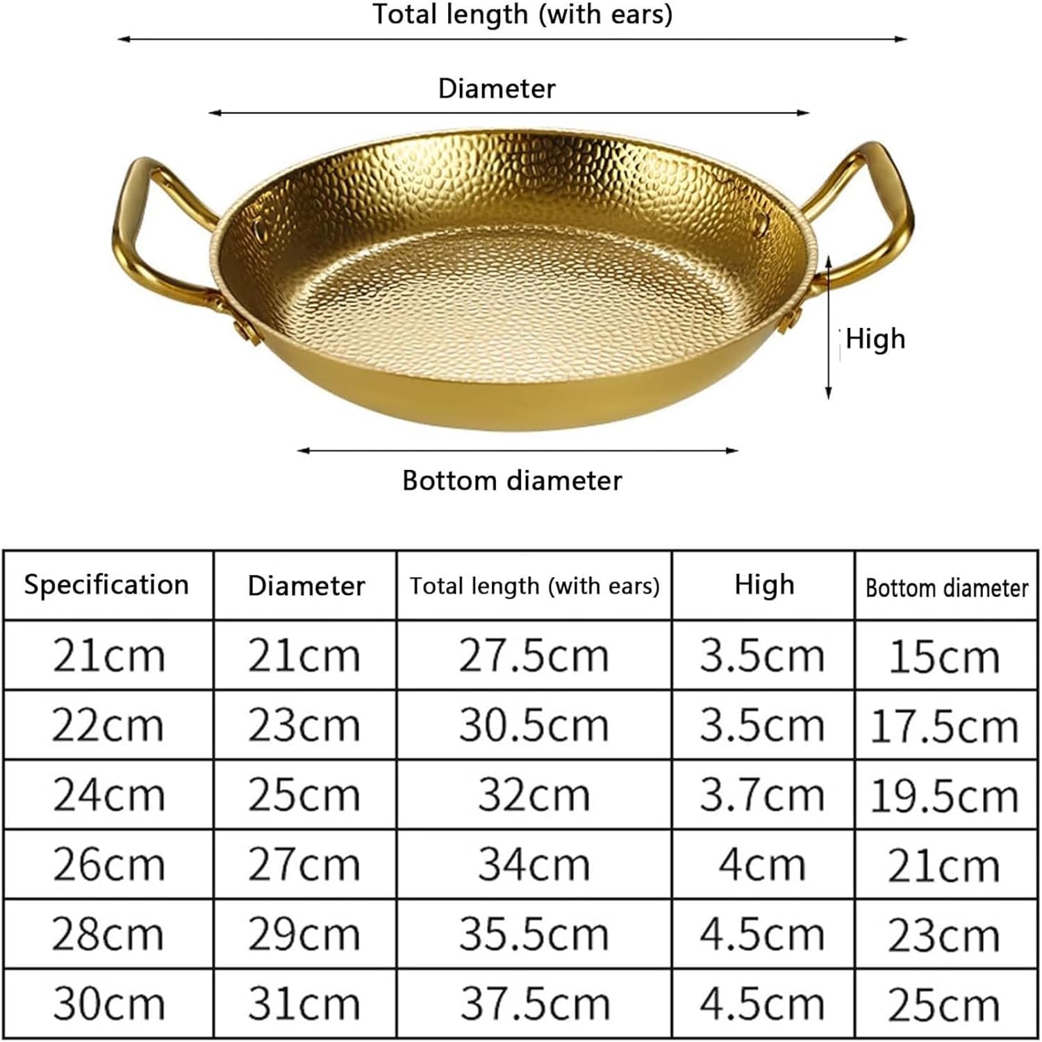 High quality heavy duty style,classic tri-ply bonded cookware with a thick aluminum core and durable stainless steel to whip up quick bites and epic feasts.With Three bonded layers of stainless steel and responsive,this collection gives cooks the fast and the even heat distribution they need to sear ,saute ,and simmer for better cooking results.Super speed heat flow for fuel saving 20%Oven and dishwasher safe, compatible with all cooktopsSpecifications:Type: Spanish Paella PanMaterial: 304 StainlessSteelColor: Silver, GoldSize: 20cm,22cm,24cm,26cm,28cm,30cmFeature: Non Stick, Uncoated, Hand Hammered, Dishwasher-SafeApplication: Home, Kitchen, Restaurant, Party, Outdoor, CampingServer: 2-6 PeoplePackage List:1 x Spanish Paella Pan