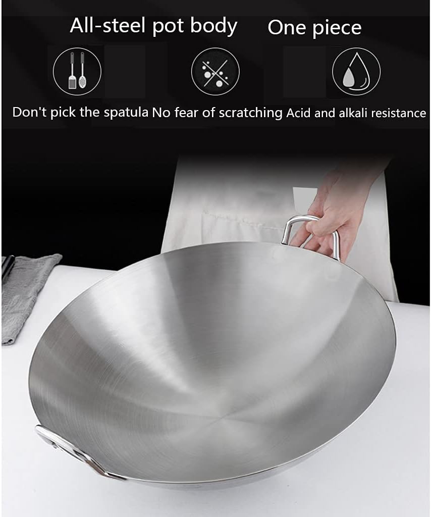 Describe: Type: Double ear stainless steel wok Material: Stainless steel size: Caliber: 40cm/43cm/46cm/50cm/53cm/60cm Thickness: 1.8mm Pot depth: 11.3cm/11.8cm/14cm/15cm/16cm/17.5cm Handle: double ear handle Type of frying spoon: stainless steel frying spoon Features: not easy to rust, less oily smoke, not easy to stick to the pot,Uncoated Applicable scenarios: Commercial Applicable object: gas stove Product application: fried, boiled, braised, stewed, steamed Package Included: Double ear stainless steel wok and Stainless steel frying spoon Care instructions: 1. Please wash and dry thoroughly after each use to avoid food residues, warm water is better; 2. The cleaning tools can choose sponge, scouring pad and detergent and special cleaning agent for stainless steel; 3. It is not recommended to use steel wire balls and decontamination powder to wash the pots and utensils, which will cause the brightness of the mirror polishing to darken and become old; 4. If there is a paste pot situation, it is recommended to soak it in warm water until it is soft before cleaning; After the promotion: We take full responsibility for our products. If you have any questions about our products, please feel free to contact us. We will assist you in solving the problem. Notes: Dear buyer, due to lighting effects, display brightness, manual measurement, etc., there may be slight differences in color and size between the photo and the actual product. Sincerely hope you can understand! Thanks!