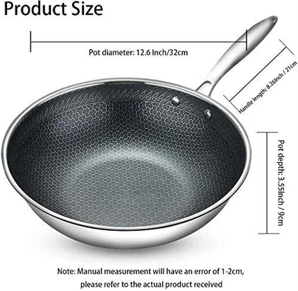 Product Name: Woks & Stir-Fry PansMaterial: 304 stainless steelWeight: 2kgSpecifications: 32cm / 12.6 inch (manual measurement allows 1-2cm)Application: gas stove, induction cooker, electric stove, etc.Rivet connection, firm connection, not easy to fall off.Stainless steel handle for comfortable grip and heat insulation.Fast heat conduction without deformation, uniform heating, energy saving and environmental protection.If you have any questions, please contact us in time, we will answer you and resolve the problem within 24 hours.