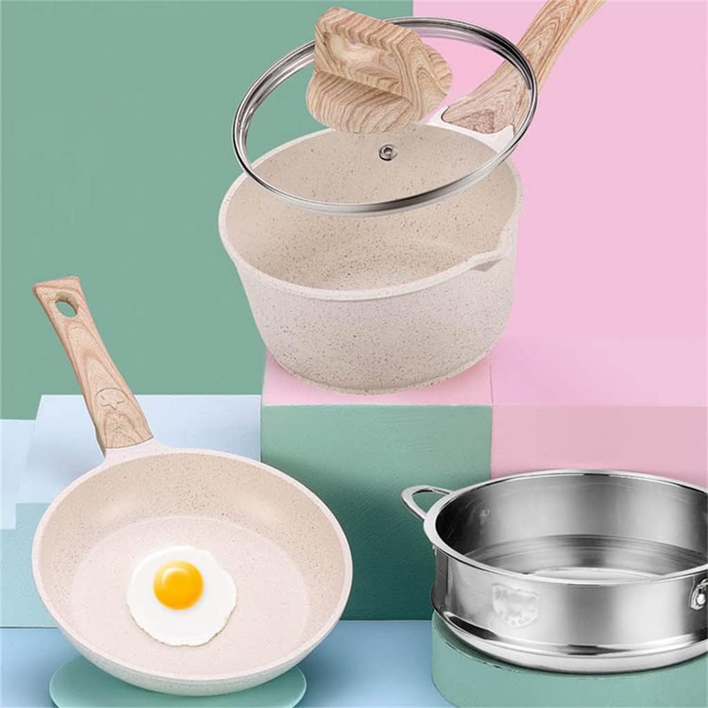 Hello, welcome! Welcome to my shop!Feature:Five-layer thickened pot body more uniform heat conduction non-stick bottom convenient for cooking.Thickened composite bottom fast heat conduction common use for gas stoves induction stoves and electric ceramic stoves.One-piece molding no rivets easy to clean and the enlarged container body is not easy to overflow.The humanized diversion port design makes it easier to pour soup and oil prevent leakage from the pot and keep the countertop cleanWooden handle strong and durable handle comfortable grip heat insulation and anti-scaldingMaterial: Aluminum alloySize: 16cm pot + 18cm frying pan 18cm pot + 18cm frying panPackage includes: 1 set of pots and pans (other products not included)hint:Please allow slight deviation due to manual measurement.Due to differences between monitors pictures may not reflect the actual colors of the item. Please refer to the actual product.TATSEN wishes you a happy life!