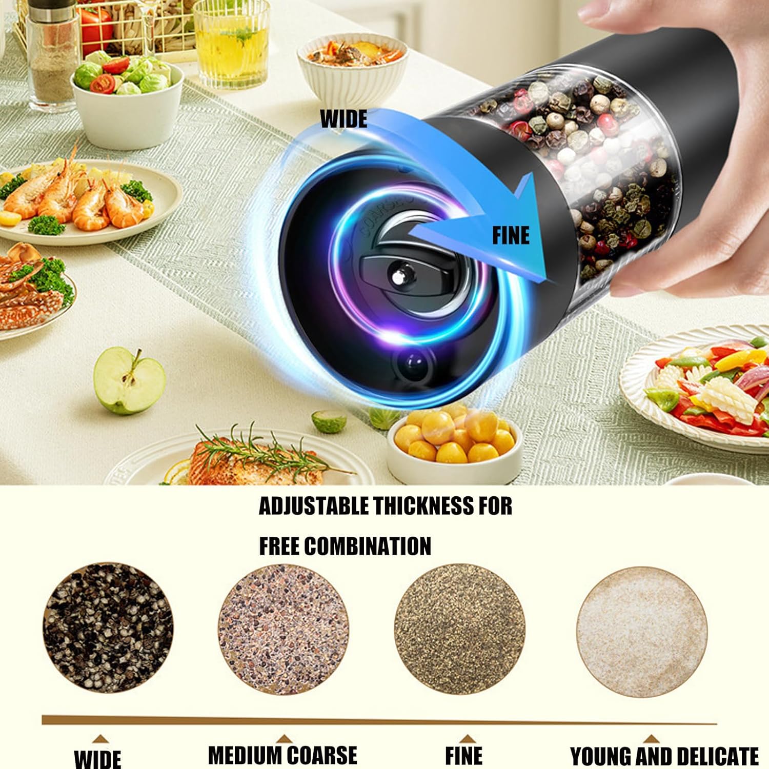 Rechargeable Cordless Electric Pepper And Salt Grinder Adjustable Coarseness Setting Cordless Kitchen Tool For SpicesFeatures:This rechargeable electric pepper and salt grinder features adjustable coarseness setting for perfect spices texture control, combining cordless convenience with precisions grinding technology.Craft from ABS, its compacts motorized design delivers powerful grinding for salt, peppercorns, and spices with button operations.Ideal for home cooks, busy professional, and baking enthusiasts seek restaurant seasoning control in daily meal preparation.Enhances kitchen countertops efficiency or elevates dining experiences with this portable spices grinder's quick recharging capability and travel friendly size.The ergonomic button activated mechanism ensures single hand operations during cooking, while its modern design complementing modern kitchens aesthetic seamlessly.Specifications:Component: ABSGrinder Color: SilverOptional Styles: A 2pcs Grinder with Clear Stand(without charging function), B 2pcs Grinder with Black Charging Base, C 1pc Grinder without BaseGrinder Size:Approx. 9x9x22cm/3.54x3.54x8.66inPackage Includes:1 set Electric GrinderNote:Please allow 1-3cm error due to manual measurement. please make sure you not mind before you bid.Due to the differences between different monitors, the picture may not reflect item's actual color.