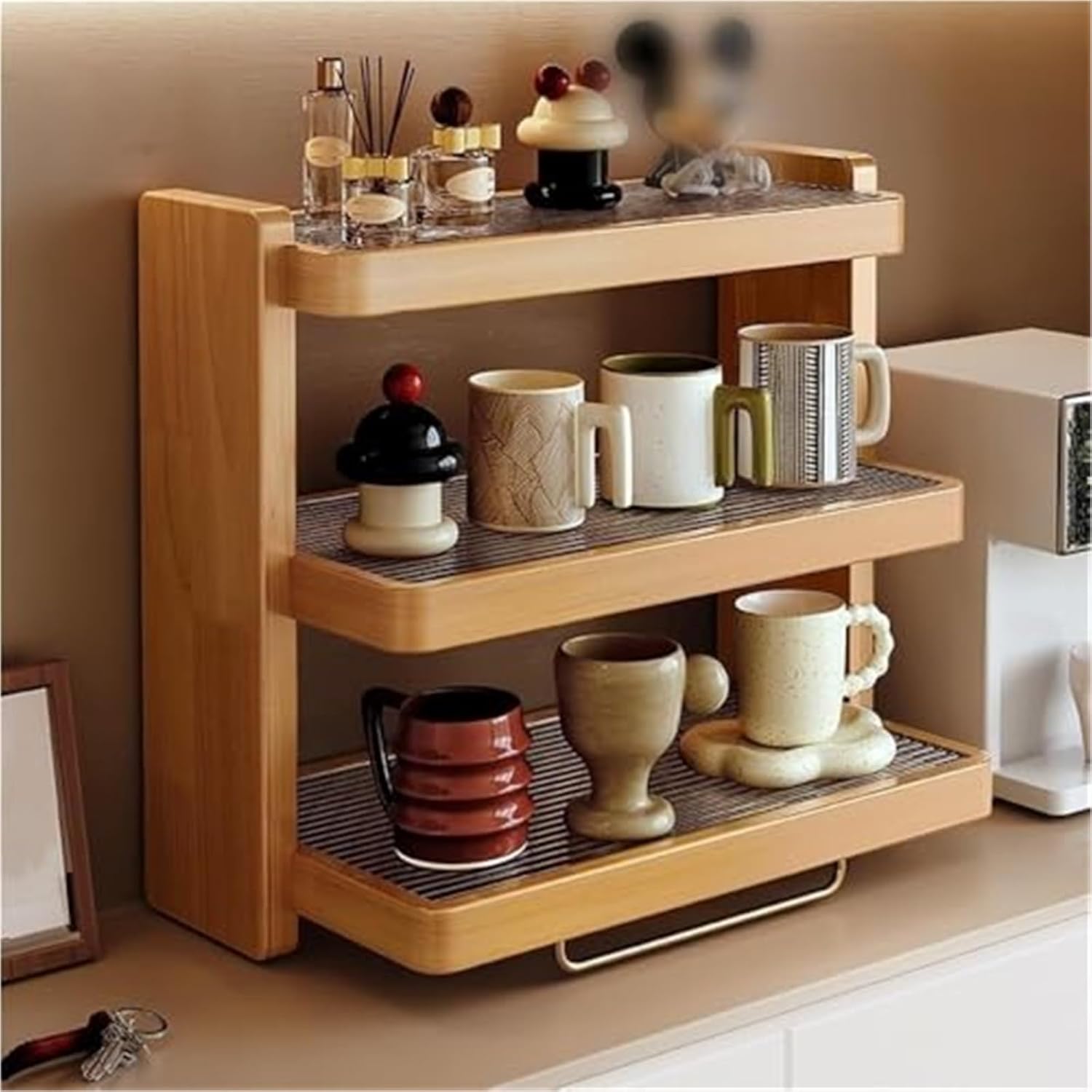 This mug holder stands out with its highly transparent acrylic base, which brings a contemporary and sleek look to the piece. The transparency of the acrylic allows it to blend seamlessly with different settings, while also highlighting the beauty of the solid wood component. It adds a modern touch that can enhance the overall aesthetic of your kitchen or coffee bar, making it a stylish and eye-catching addition to your space.The stepped design of the mug holder is both practical and visually appealing. It provides a logical and organized storage solution, allowing you to neatly display a variety of items. You can easily arrange your mugs, cups, and other small kitchen essentials in an orderly manner, making them easily accessible. The stepped design also maximizes the use of space, ensuring that you can store more items without overcrowding. It's a design that combines functionality with aesthetics, making it a great addition to any kitchen or coffee bar.Product details:Name: Cup rackMaterial: WoodColor: Brown , YellowSize: 16.5''x7.8'' , 20.4''x7.8''Package: 1x desktop cup rackWarm Tips:1.other content in the photo is not included.2. Due to monitor differences, there may be slight color difference.3. Due to the measurement method, measurement method and other factors, there may be a slight error.Please measure the size of the product as needed.
