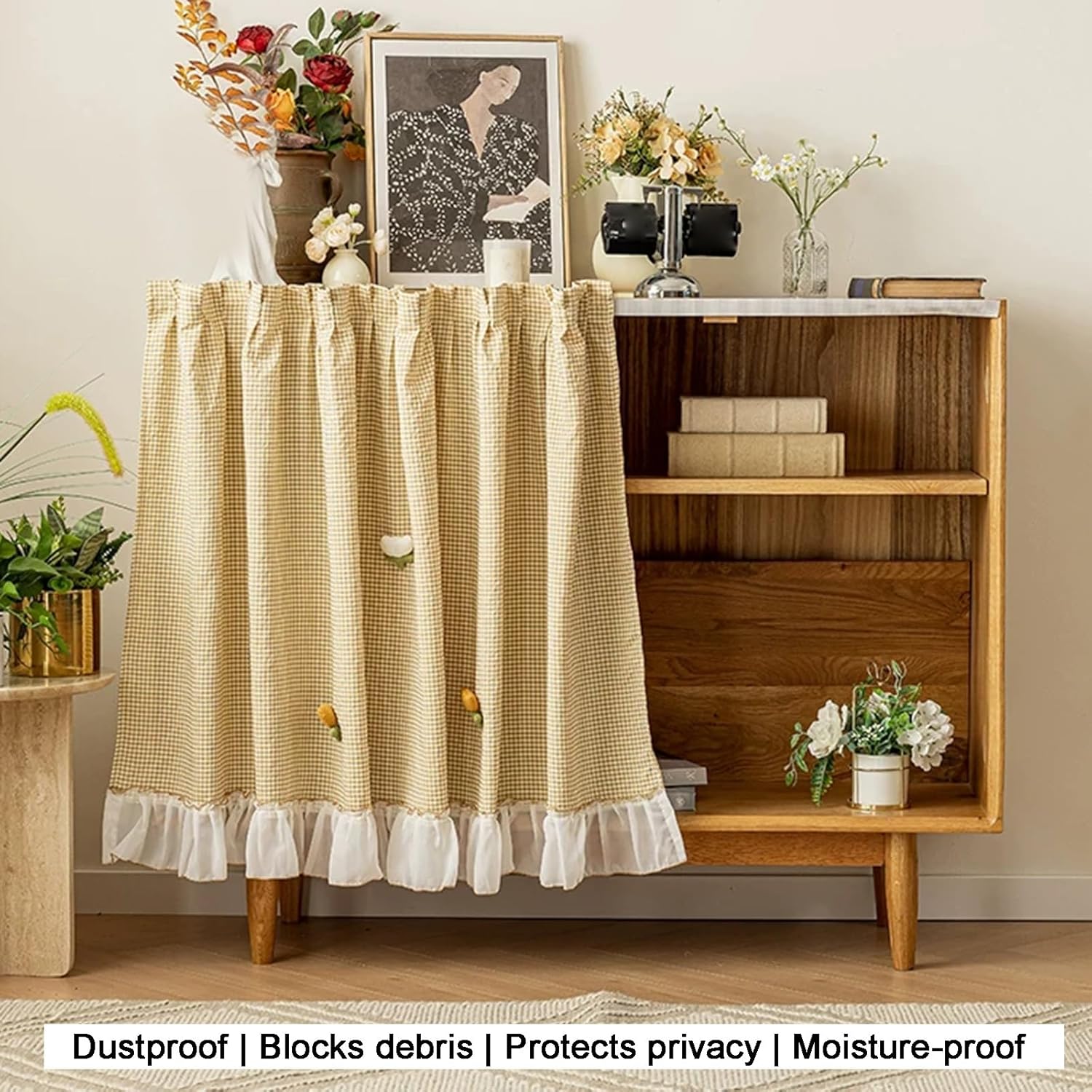 Shelf curtains combine the practical functions of dust protection, concealing clutter, providing privacy, and allowing for ventilation and easy opening and closing. At the same time, the natural folds give the curtains a layered and flowing look, softening the rigid lines of the shelves and enhancing the overall decor, thus upgrading both practicality and aestheticsSpecificationsMaterial: Lace materialProcess: Printing and dyeingFeatures: Pleated designMounting method: adhesive stripAdhesive strip width: 2cm/0.8inDimensions: Width x HeightWidth: 40-140cm/15.7-55inHeight: 60-120cm /23.6-47 inPackage Contents:1 x cabinet curtains