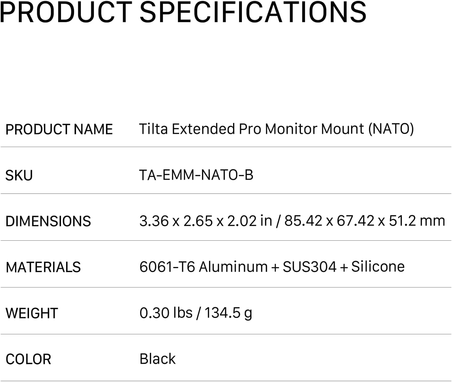 | BuiltIn Media | 1:Tilta Extended Pro Monitor Mount (Without NATO) - Black(TA-EM-B)*1, 2:Tilta 36mm NATO Rail Attachment - Black(TA-NRA-36-B)*1 |