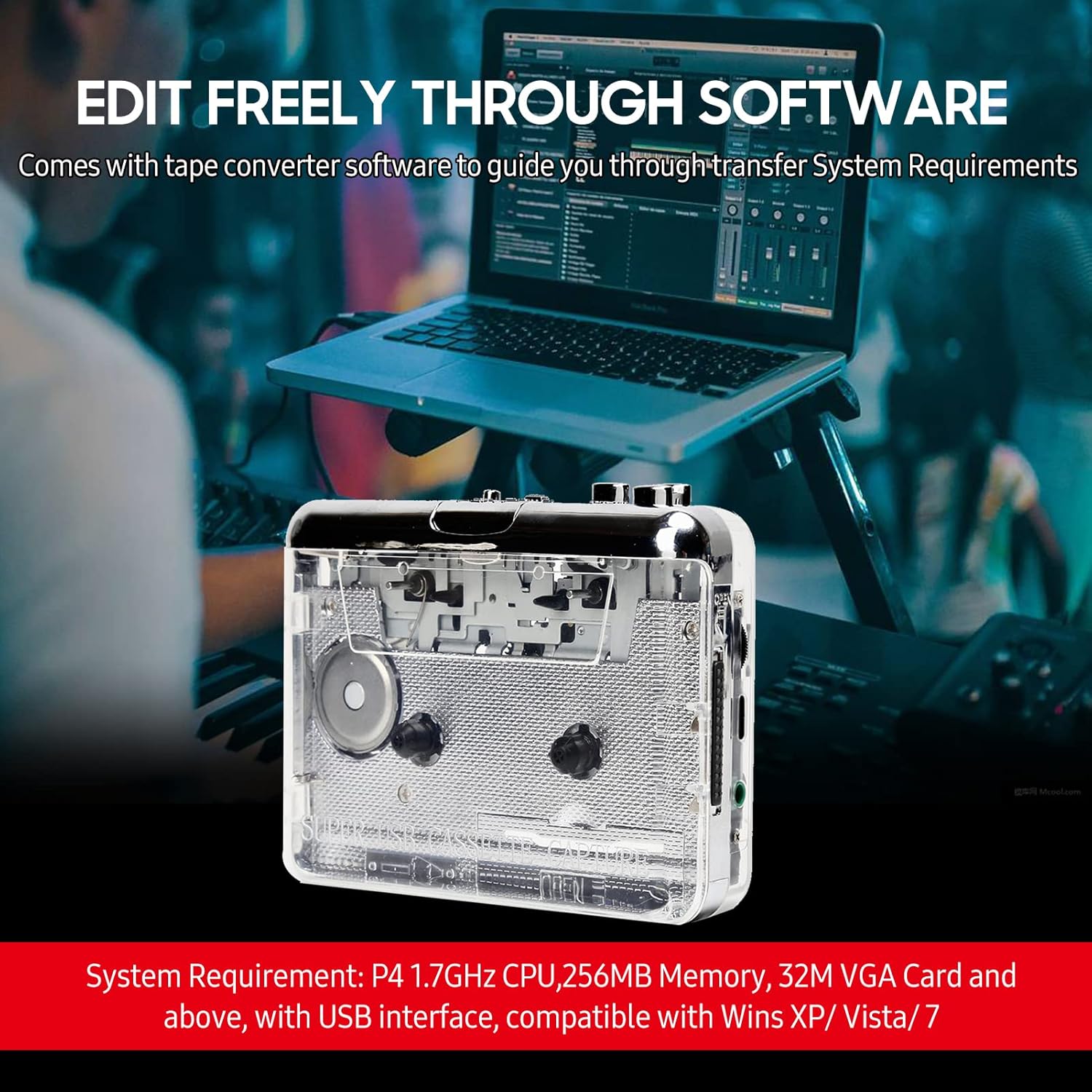 Portable cassette player converts your old mixed tapes and cassettes to MP3 format, and you can play them on any MP3 player. It can keep your treasured memories. Transparent shell makes it more concise and beautiful. Note: Size and color may be slightly different due to manual measurement and different light conditions. Thanks for understanding. Specifications: Color: Transparent Material: ABS Recording Mode: WAV, MP3 Power Consumption: <400mW Software: Compatible with 'Audacity' System Requirement: P4 1.7GHz CPU, 256MB Memory, 32M VGA Card and above, with USB interface, compatible with Wins XP/ Vista/ 7 Power Supply: 2 * AA Battery (Not included) or Type-C USB Cable Item Size: 114 * 82 * 33mm / 4.49 * 3.23 * 1.30in Item Weight: 172g / 6.06oz Package Size: 15 * 11.2 * 4cm / 5.91 * 4.41 * 1.57in Package Weight: 270g / 9.52oz Package List: 1 * Cassette Player 1 * Software CD 1 * USB Cable (Type-C) 1 Pair of Earphones 1 * User Manual (English)