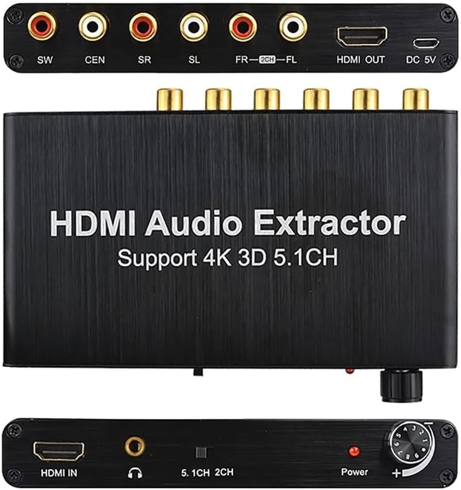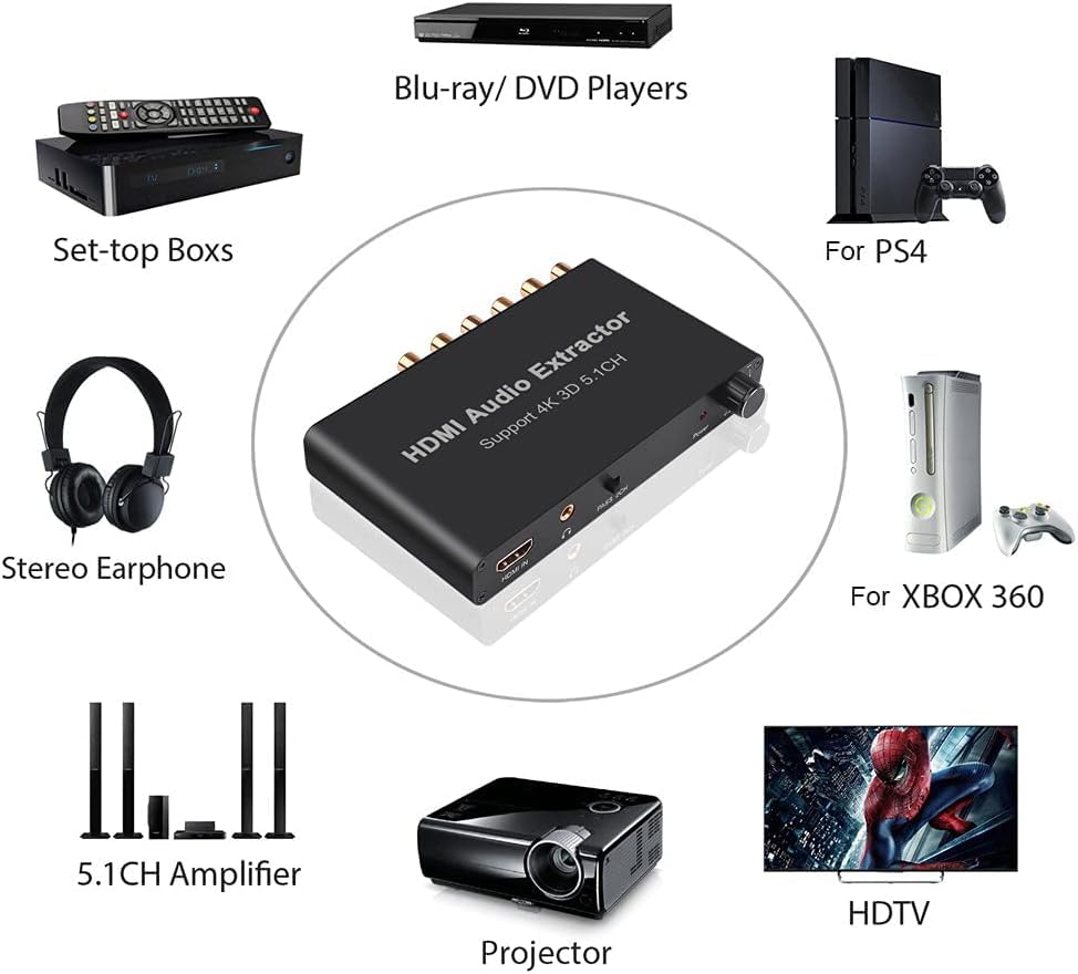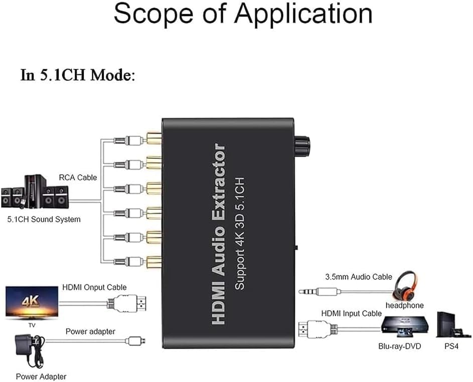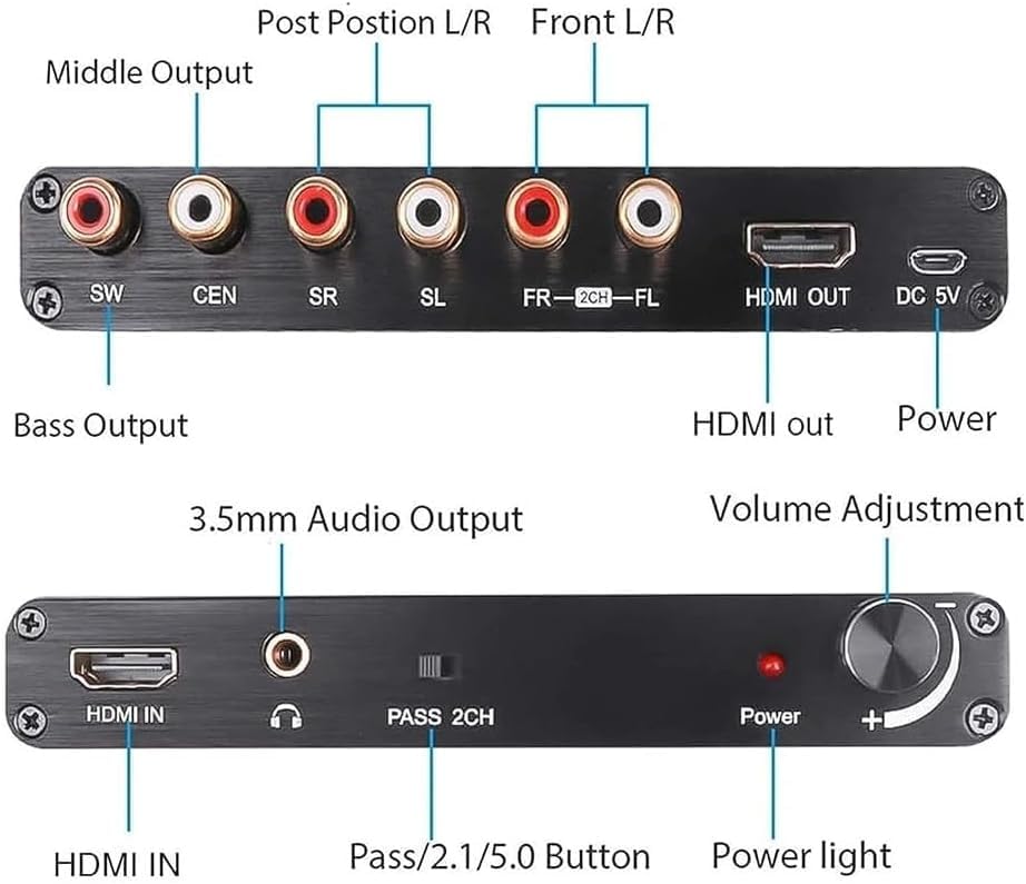 Product Description -Build-in high performance RTOS operating system and audio decoder chip; support DTS/AC-3. -Super fast start time about 3 seconds. -Input: HDMI, Output:HDMI;SW,CEN,SR,SL,FR,FL; 3.5mm Headphone Port -HDMI Input Resolution: Up to 3840x2160@30Hz;4096x2160@30Hz. -Auto decode AC-3/DTS (LPCM/PCM/RAW) input signal without any action Specification: HDMIResolution:2160p@30Hz/ 1080p@50/60Hz/1080i/720p/1576i/480p/480i SupportVideoColorFormat:24bits/deep color 30bit,36bit AudioOutput:2CH/5.1CH Analog Audio MaxBandwidth:340MHz MaxBaudRate:10.2Gbps Input/ Output TMDS signal:0.5-1.5Volts p-p(TTL) Input/ Output DDC signal:5Volts p-p(TTL) SupportAudioFormat:MP3,AC3,DTS,WAV,WMA,AAC,ALAC,FLAC,APE,OGG,M4A Signal Noise Ratio:120db Stereo Isolation:80db(1KHZ) Channel Unbalance:0db Sampling Rate:32~192 KHz Bit Rate:16~24 Bit Response Frequency:20Hz~20KHz+/-0.7db THD:20Hz~20KHz 0.25-0.065% THD+N:1KHz 0.15% Max Power Current:420mA Power adapter format: input:AC(50/60Hz)100V-240V, Output:DC5V/2A Packing list Audio Decoder*1 Precautions: Please refer to the manual for correct usage to ensure its longevity. 1. Do not expose this unit to damp, high-temperature, dusty, corrosive, or oxidising environments. 2. All components must be protected from severe vibration, impact, or dropping. 3. Do not touch the power adapter plug with wet hands. 4. When unplugging, hold the plug itself. Do not pull directly on the power cord. 5. Switch off the device when not in use for extended periods. 6. Do not open the casing, and refrain from touching internal components. 7. Use only the original USB power cable supplied with the device.