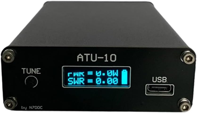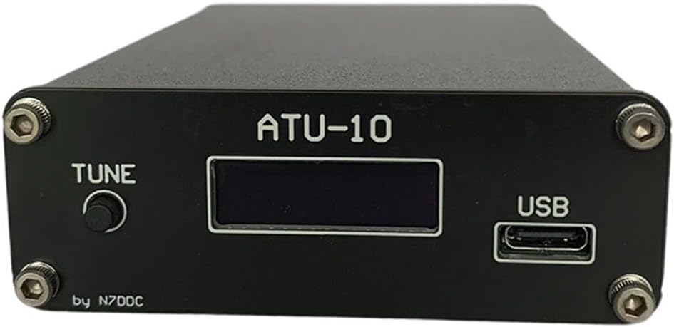 Features:* and * ATU-10 ATU10 QRP by N7DDC Automatic Antenna Tuner .6Specifications:Part Name: Automatic Antenna TunerMaterial: MetalSize: L*W*H: 100*75*26 mmColor: BlackWhat's new in firmware .61 - Button failure resolved2 - Bus transmission to for OLED is more stable3 - No continuous data transmission to the displayInput power: minimum 1W, maximum 15WThe control button has only 3 functions1. A short press resets the tuner and sets all relays to their initial state, where all reactive components are disabled and do not the signal through the tuner,2. A long press enters mode3. Pressing and holding for more than 5 seconds will cause the firmware version to be displayed on the display.The tuner has 3 power modes1. mode, the display shows the parameters for 5 minutes;2. The tuner then goes to sleep and the display turns off. A short press of the button wakes up the tuner.3. After 30 minutes of sleep, the tuner turns off completely and a long press of the button (more than 3 seconds) turns it on.Current consumption in active mode is 12mA, in sleep mode it is 170μA, and in the off state it is 37μA.Power supply operating voltage: 5V DC (Type C)Maximum operating current: 12mAMaximum operating power: 10WMaximum measurable power: 15WMinimum power: 1WMinimum measurable power: 0.1WPower measurement step: 0.1WPower measurement accuracy: 10%Maximum inductance: 18.37 µHMinimum inductance: 0.1μHMaximum capacitance: 4079 pFMinimum capacitance: 22 pFfrequency range: 1.8~30MHz (expandable to: 1.8-50MHz or higher)Control protocol: for ICOM protocolDisplay: 0.91 inch for OLED 128*32Charging voltage: 5V DC (Type C)Built-in battery: 2xLi-Ion 14500 (3.7V/850mAh)RF interface: BNCPackage Contents:1 x ATU10 (screen has 3 colors, shipped randomly)1 x Type-c cable