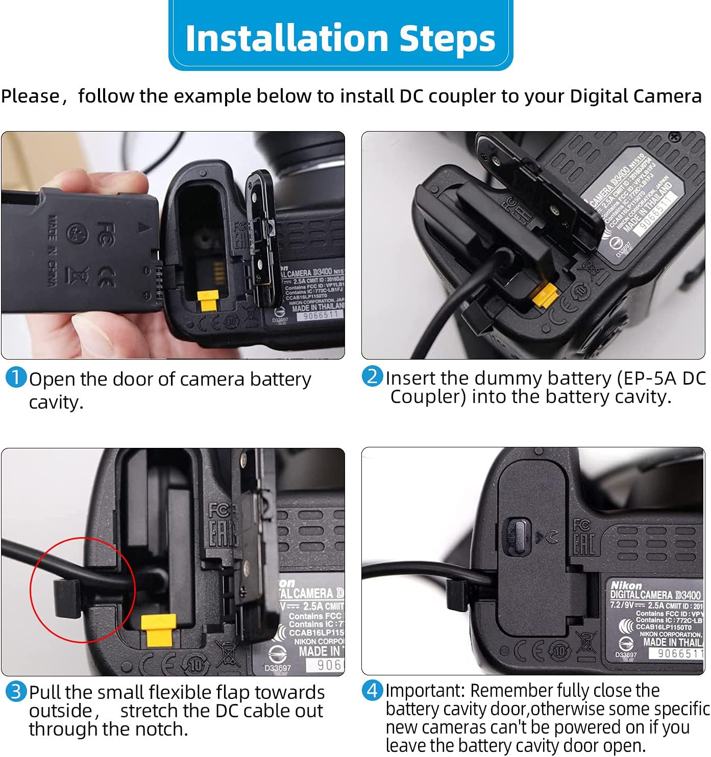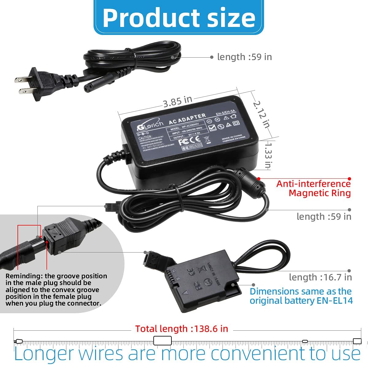 Glorich EH-5 Plus EP-5A replacement AC power adapter is designed to supply uninterrupted power for your camera while downloading pictures to your computer, for extended work in a studio,or while viewing images while connected to your TV or VCR,which doesn't require you to go through the authenticity check on the screen from time to time.Compatible with:Digital Cameras Nikon Coolpix P7000 P7100 P7700 P7800 Df D3100 D3200 D3300 D3400 D3500 D5100 D5200 D5300 D5500 D5600.Package Include:1 x AC adapter EH-5 ( replace original EH-5, EH-5a or EH-5b)1 x AC cord (length:1.5m)1 x EP-5A DC coupler power connector dummy battery (EN-EL14 ENEL14 / EN-EL14a ENEL14a battery replacement)Guarantee:1.12-months warranty is offered with the purchase of Glorich product.2.Online customer service is provided when you have any query regarding product or using guidance needed. If you are not satisfied with any product or delivery, please contact us at the first time.Instructions for use(IMPORTANT):1.Installing the EP-5A DC coupler into the battery compartment, routing the cable through the side / the slot in the camera and fully closing the battery compartment door;(key step if you leave the battery compartment lid open the camera won't be able to be powered on.)2.Connecting the DC coupler with the AC power adapter;3.Connecting the adapter with an AC cord to plug into the outlet.◆Please Note:This kit is used to supply power for the camera. It is not possible to charge the battery EN-EL14 or EN-EL14a.