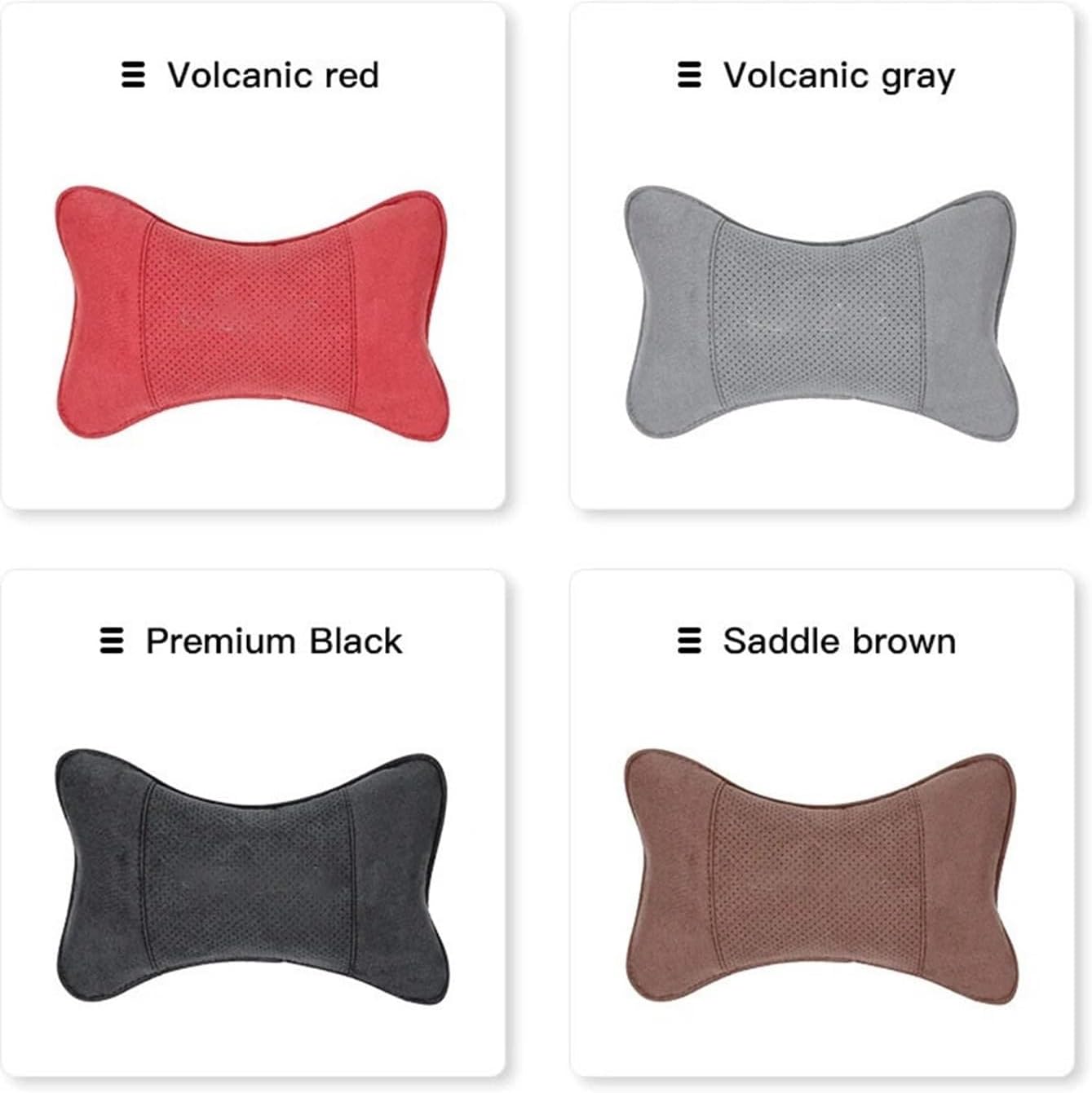 Material: suede leatherColors: Red, Brown, Black, GreySize: As shown in the picturefeatures. Exquisite workmanship, strong practicality, and durability.Neck pillows can effectively prevent the floating, fatigue, and pain caused by long-term bending of the car neck, making your driving life more comfortable, safe, and healthy.Filling material: synthetic fiberMaterial: synthetic leatherColor: Black, Brown, Grey, RedSize: 30x16cmMaterial: suede leather, memory sponge