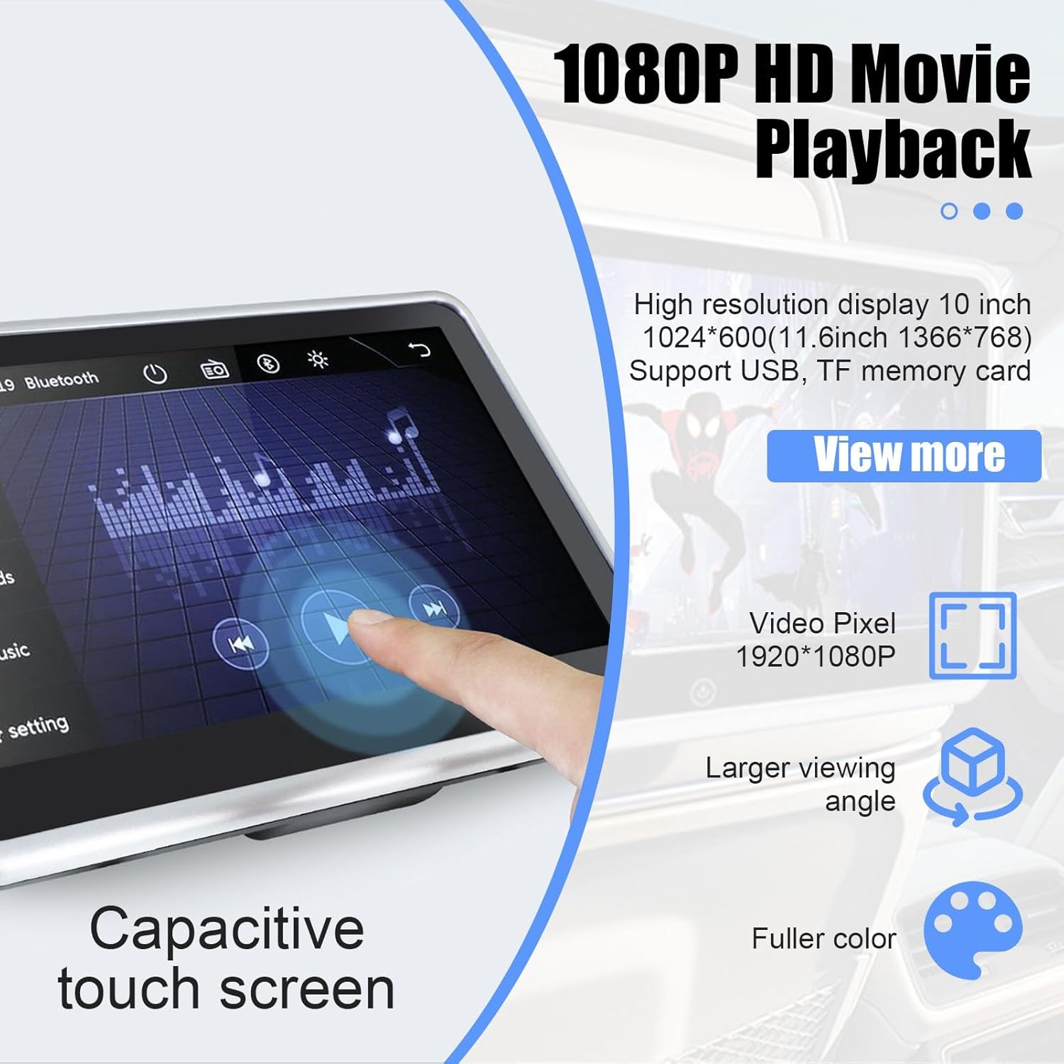 Enhance every car journey with our car headrest monitor, designed to transform the back seat into a full entertainment hub. This car headrest TV and rear seat monitor offer a premium viewing experience for kids and passengers, keeping everyone entertained during long trips. Available in 11.6 inch car headrest monitor and 10.1 inch car headrest TV sizes, it fits most vehicles and provides a clear, immersive viewing experience with a full HD 1080P monitor.➤Main Features:✔Multiple Sizes 10.1" and 11.6" car headrest monitors✔High Definition Full HD 1080P monitor with clear video✔Touch & Mirror Touch screen car monitor with screen mirroring✔Multiple Inputs USB, TF, AV input headrest monitor✔Portable & Cordless Cordless car monitor Effortless installation✔Ambient Lighting Ambient light car monitor for backseat comfort✔Kids Friendly Rear seat TV for children on trips➤Product Specifications:Available Screen Sizes: 10.1-inch or 11.6-inch IPS TFT LCD TouchscreenConnectivity: CarPlay, Android AutoPorts: USB, TF, AV In/Out, Audio, HeadphonePower: DC 12VMedia: MP3/MP4/MP5Resolution: 1366*768Compatibility: Fits most car headrestsAudio: Built-in Speaker, Car RadioMenu: Multi-language OSD SupportConnectivity: Cordless Carplay/Android Auto, USB/TF InputFeatures: 7-Color Adjustable Lighting, Offline Media PlaybackInstallation: Car Fuse Wiring or Cigarette Lighter PowerView Ratio: 80% Micro-Bezel Design➤Package List:1×Car Headrest Player1×Remote➤Warm Tips:✔Manual measurements may result in a slight 1–2 cm variation.✔Minor color differences may occur due to lighting and display ; please refer to the actual product received.✔If you have any questions, feel spare to reach out. Our team is committed to helping you and will reply within 24 hours.