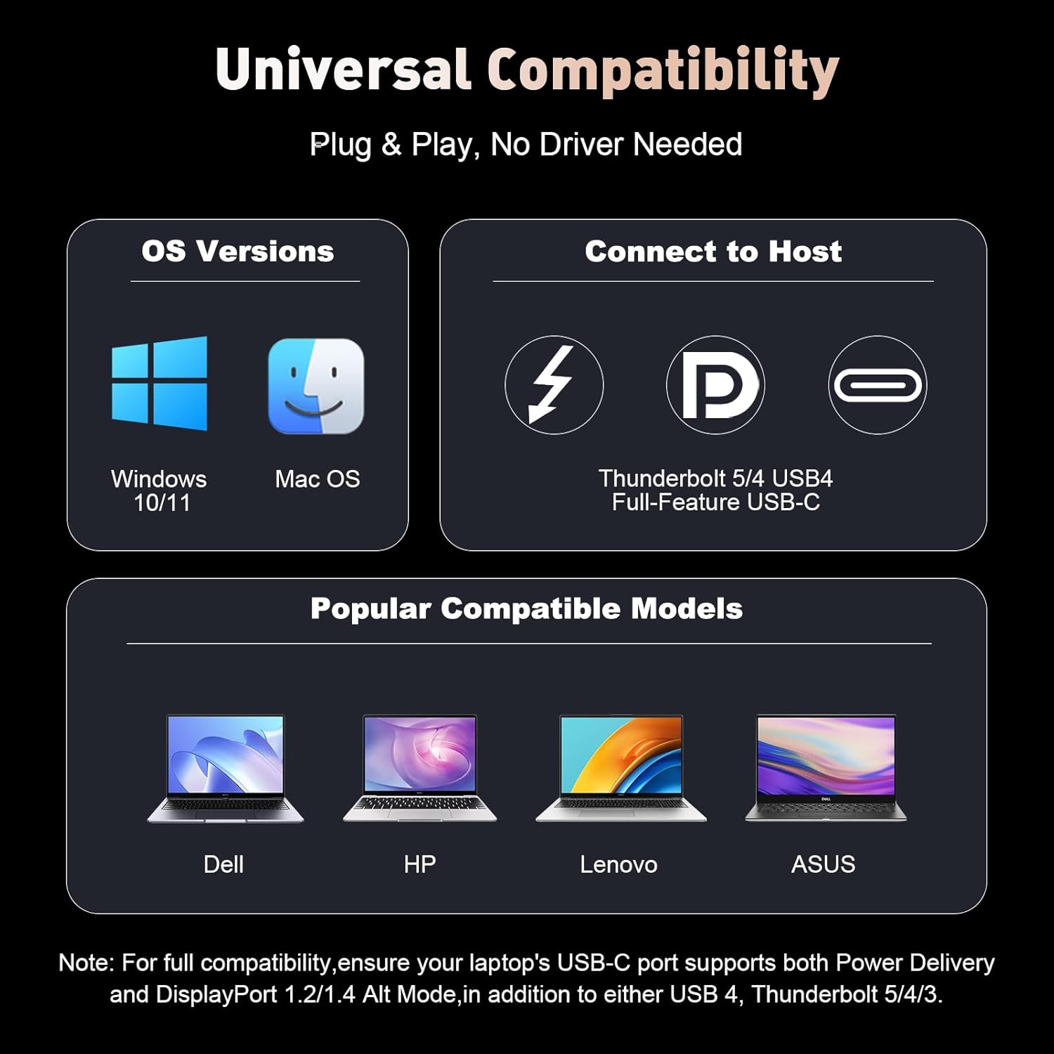 | Compatible Devices | ell XPS 9380/ XPS 13 9365/ XPS 15 2018, Dell Latitude E7370/ E7470/ E7480/ Dell Latitude 13 7000/ E7370L/ New XPS 15 i7 Lenovo Yoga 720-13IKB/Yoga 910, Yoga15 Thinkpad Ultrabook Pro, Thinkpad E590/ Thinkpad P72/ Lenovo C930; Microsoft Surface Book 2/ Surface Laptop 3, Surface Pro 7/ Surface Pro 8/ Surface Go, Galaxy Book Flex Alpha 2-in-1 13.3" QLED Touch-Screen Laptop, Galaxy Tab S5e/ Galaxy Tab S4, HP Spectre Laptop 13-af001TU/ Spectre x360 13t, Elitebook 840 G5 series/ Elitebook x360 1030 G3, Envy Geforce mx250/ Z book 15u G3 ASUS Zenbook UX330UA/ Zenbook Flip ux370u, Acer Aspire 5 2019, D17w3 Aspire c24-865, ASUS ROG Ally / Steam Deck. *Note: MacOS systems do not support triple-display mode, only can extend one display with connected monitors under the extension mode |
