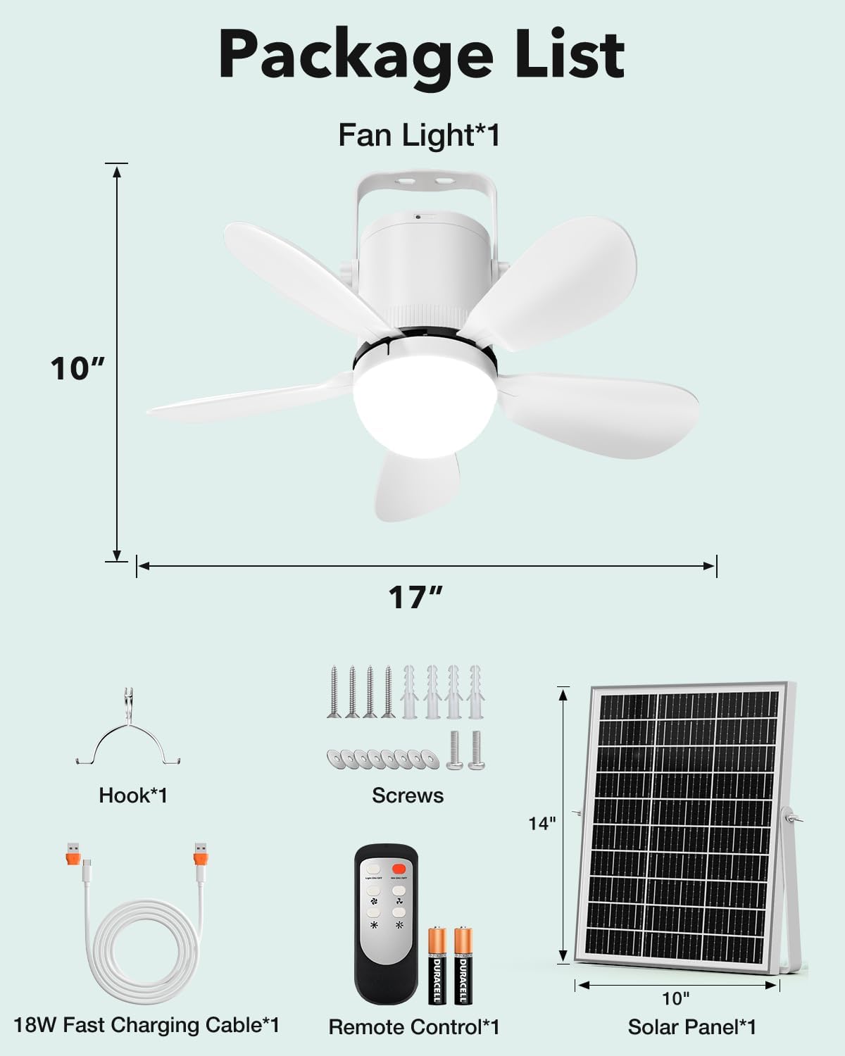 | Included Components | Fan Light Kit, Fast Charging Cable, Hook and Screw, Remote, Solar Panel |
