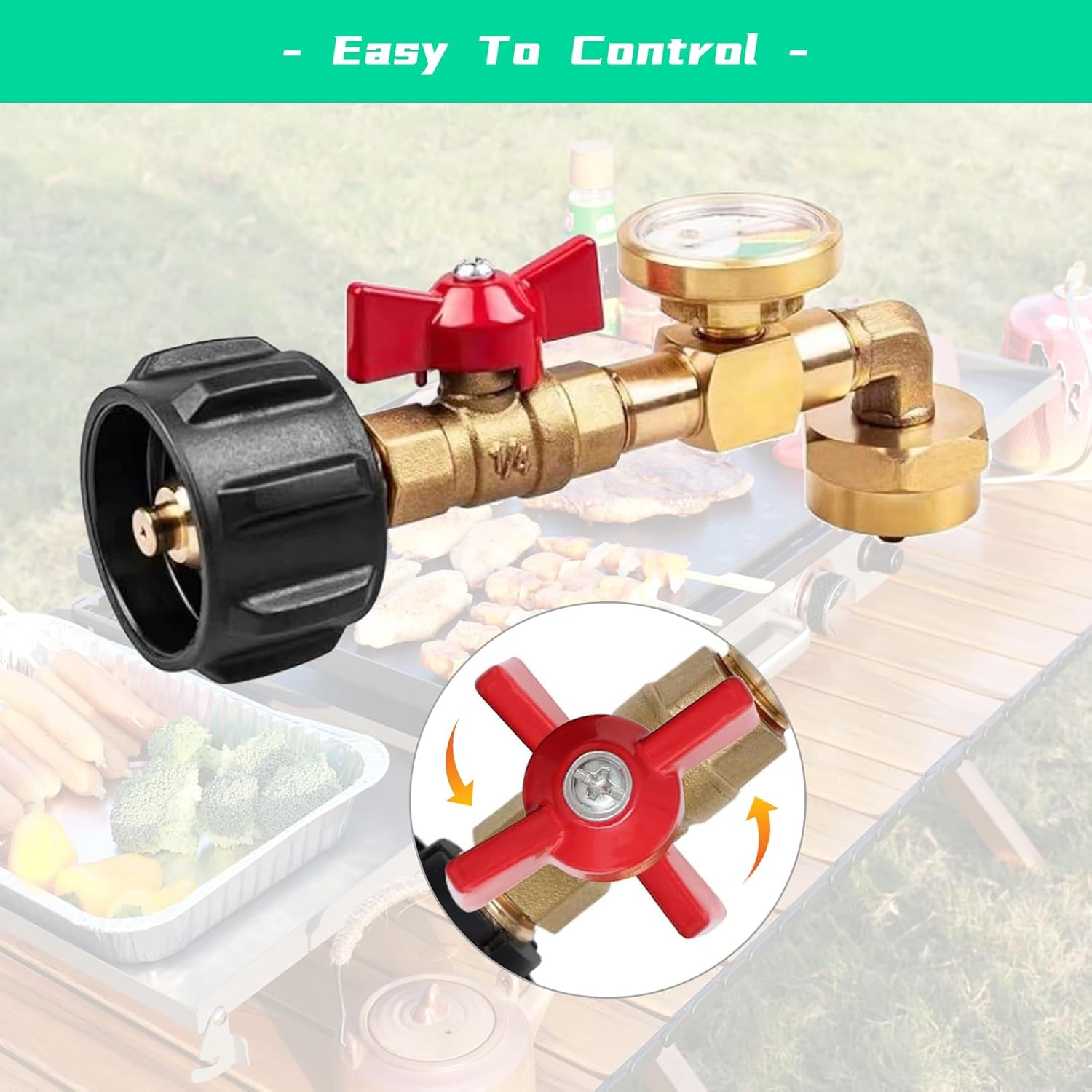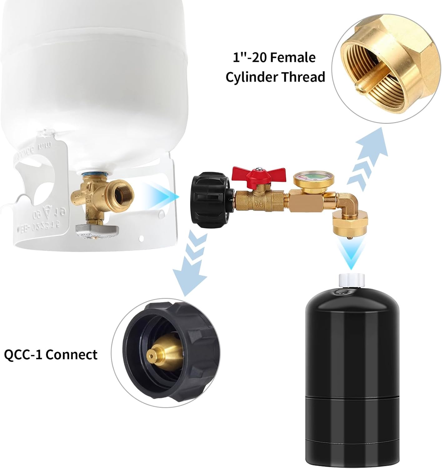Specifications: Fuel Type: Propane Material: Solid Brass Inlet: QCC-1/POL-Type 1 Outlet: 90 degree elbow, 1""-20 Female Throwaway Cylinder Switching Valve: 1/4 '' propane ON-Off control valve Upgrade: with valve and gauge What's Included: Propane Refill Adapter * 1 Cap of 1lb Tank * 4 Sealing tape * 1 Instruction * 1 How to Inflate the Propane Gas: 1. Put the empty 1 lb cylinders in a freezer for several hours. 2. Put your 5-40lb propane tank upside down and attach the QCC1 connection to your propane tank. Close the 1/4'' on-off control valve. 3. Install the 1"x 20 Female throwaway cylinder thread on the 1lb tank cylinder. 4. Open the 5-40 propane tank cylinder valve and then tun on 1/4" on-off control valve. 5. When the flow of propane gas stops, please shut off the 1/4" on-off control valve and remove it. ATTENTION: 1. Safety FirstUse only outdoors, away from flames or sparks. Close the valve before reflling. 2. Turn off all switches during installation and removal. 3. Turn on the gas for a few seconds before refilling the 1lb bottle. How to Check if Your Propane Tank is Full? A full 1 lb tank will gain about 1 lb in weight. When it's full, the gas flow will stop, usually within 1 minute. Can l Connect a 1 lb Tank to a Gas Gril!? No. This product is for transferring gas from a 5-20 lb tank to a 1lb tank. You'll need an additional adapter to connect to a grill. How to Speed Up Reflling? Place the empty 1 lb tank in the freezer for a few hours before reflling.