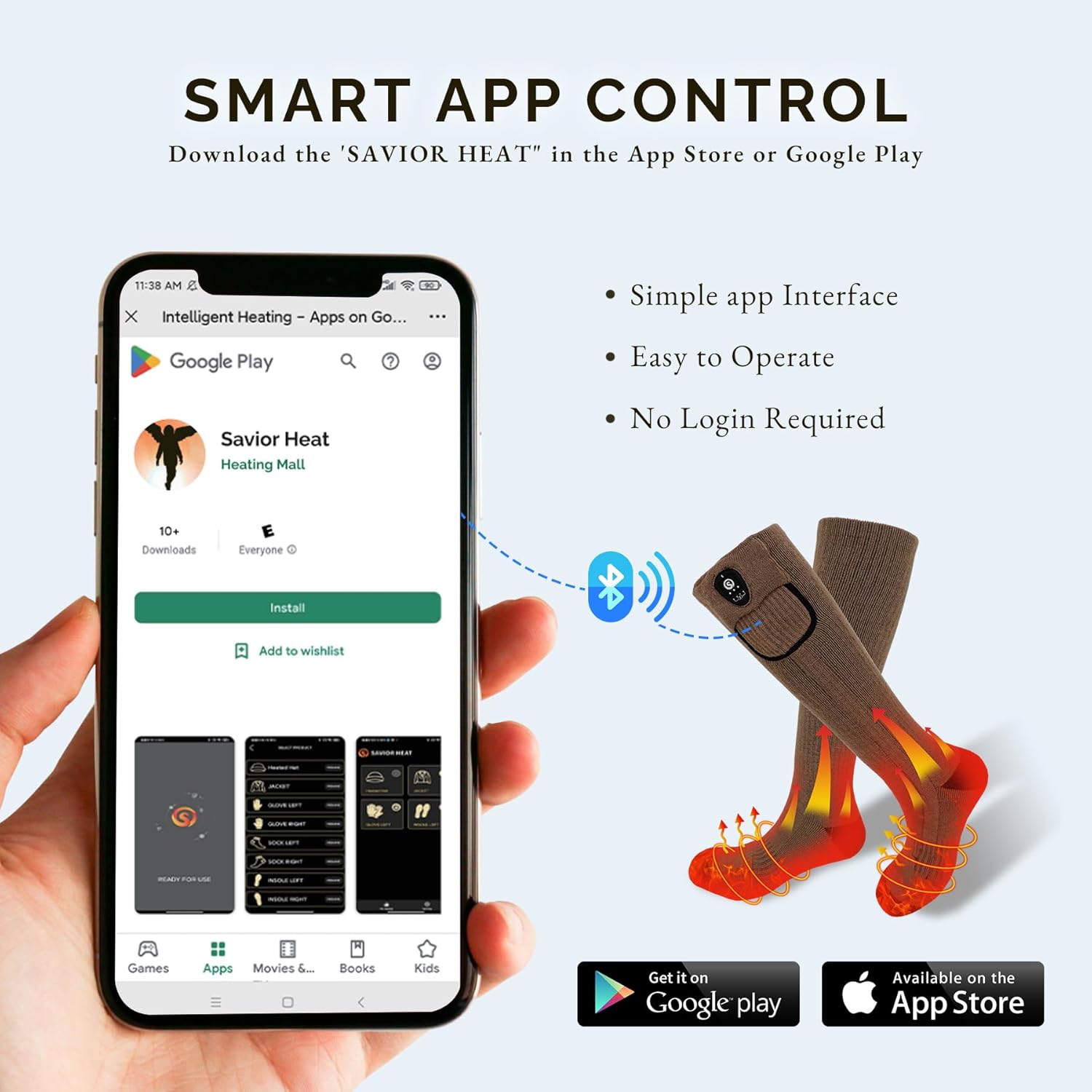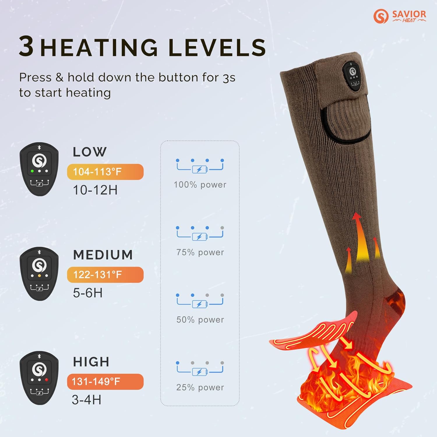 Experience cozy warmth and convenient control with SAVIOR HEAT Merino Wool heated socks with app connectivity. With 3 adjustable heat settings, you can customize the level of toasty comfort to suit your needs. Whether you're lounging at home, working in a chilly office, or braving the great outdoors, these heated socks for men women will keep your feet delightfully warm. The app allows you to monitor and adjust the temperature with ease, ensuring optimal warmth at all times. Crafted with high-quality materials, these heated socks are designed for long-lasting durability and exceptional insulation.