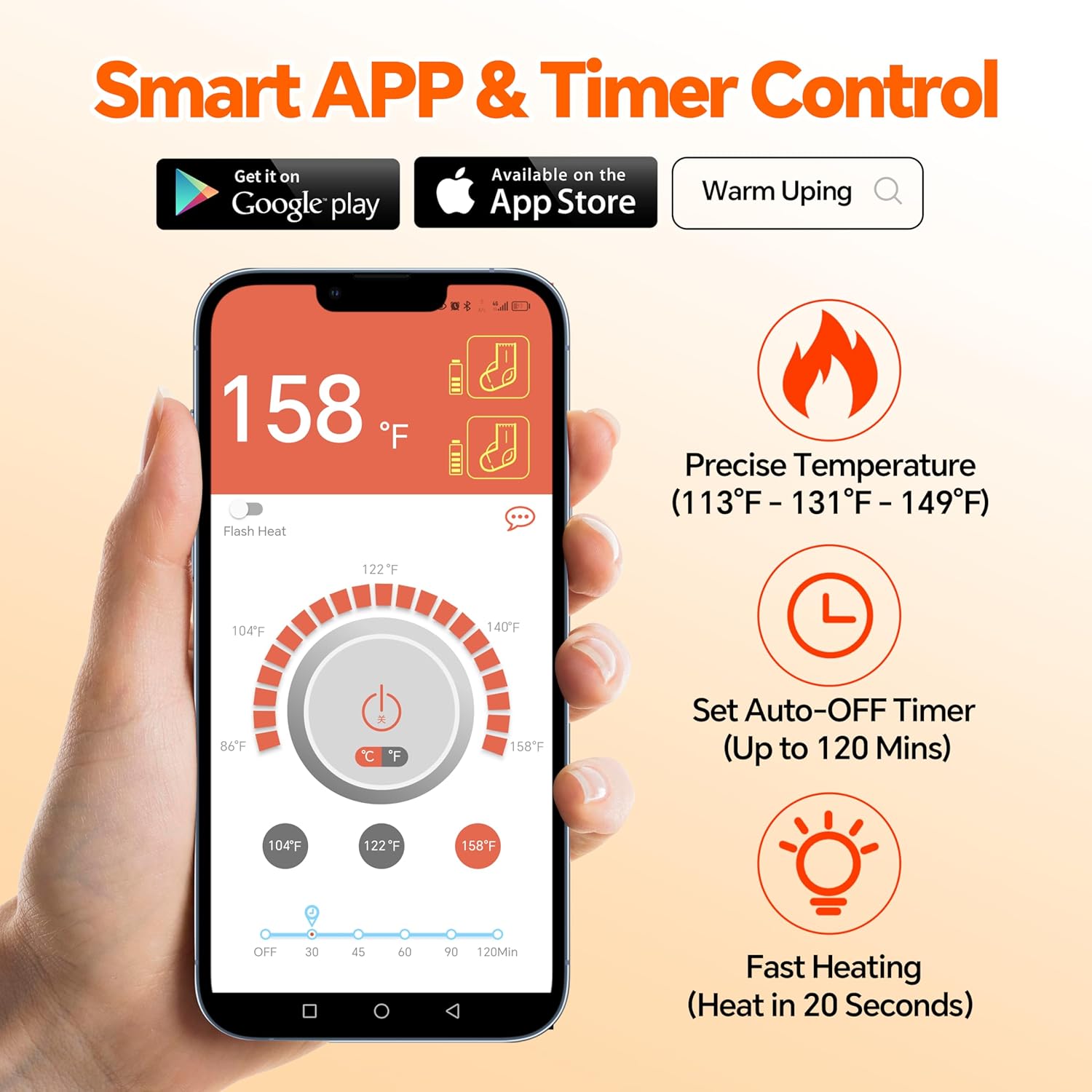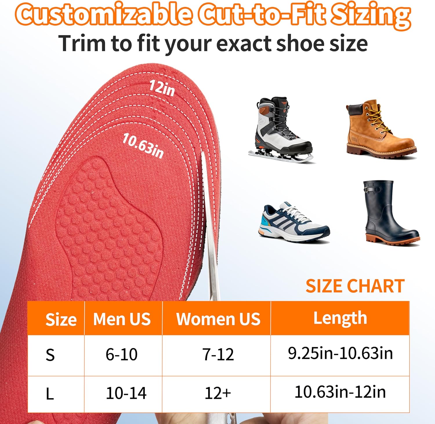 Conquer the Cold: Professional Smart Heated Insoles (5000mAh)Whether you are braving the elements for outdoor work, waiting patiently in a hunting stand, or carving down ski slopes, cold feet can end your day early. Our Upgraded App-Controlled Heated Insoles are designed to keep you warm, active, and comfortable in the harshest winter conditions.Why Choose Our Smart Heated Insoles?1. Power That Lasts All Day (5000mAh) Each insole is powered by a high-capacity 5000mAh rechargeable battery, engineered to provide up to 11 hours of continuous warmth on standard settings. Perfect for long work shifts, all-day hunting trips, or camping adventures.2. Intelligent App Control (86°F - 158°F) Adjust temperature effortlessly via your smartphone. - Precise Heat: Adjust from 86°F to 158°F. - Smart Timer: Set a 120-minute auto-off timer. - Convenience: Control power without removing your boots.3. Secure Fit with 65cm Cable & Anti-Slip Designed for movement and comfort. - 65cm Flexible Cable: Connects the insole to the calf strap, ensuring full range of motion without pulling. - Anti-Slip Texture: Specialized surface prevents the insole from sliding inside your boot. - Ultra-Thin Profile: Fits seamlessly into work boots or ski boots without overcrowding.4. Waterproof & Washable Design Built for real-world durability. The insoles are waterproof and easy to maintain. You can simply use a brush to clean the surface (Hand Wash recommended), keeping your gear hygienic and ready for the next use.5. Rapid Heating & Dual Charging Carbon fiber elements heat up in seconds. The included Dual-Head Charging Cable allows you to charge both battery packs simultaneously, significantly reducing wait time.6. Customizable Cut-to-Fit Size Trim the insoles for a perfect fit using the guide lines: - Size S: Fits US Men 6 - 10 / US Women 7 - 12 - Size L: Fits US Men 10 - 14 / US Women 12+ Tip: Use your existing insole as a template for the best fit.Package Includes: 1 Pair of Heated Insoles, 2x 5000mAh Batteries, 2x Calf Straps, 1x Dual-Charging Cable, 1x User Manual.Stay Warm, Stay Active. Essential gear for Hunting, Outdoor Work, Skiing, Fishing, and Camping. Upgrade your winter comfort today!