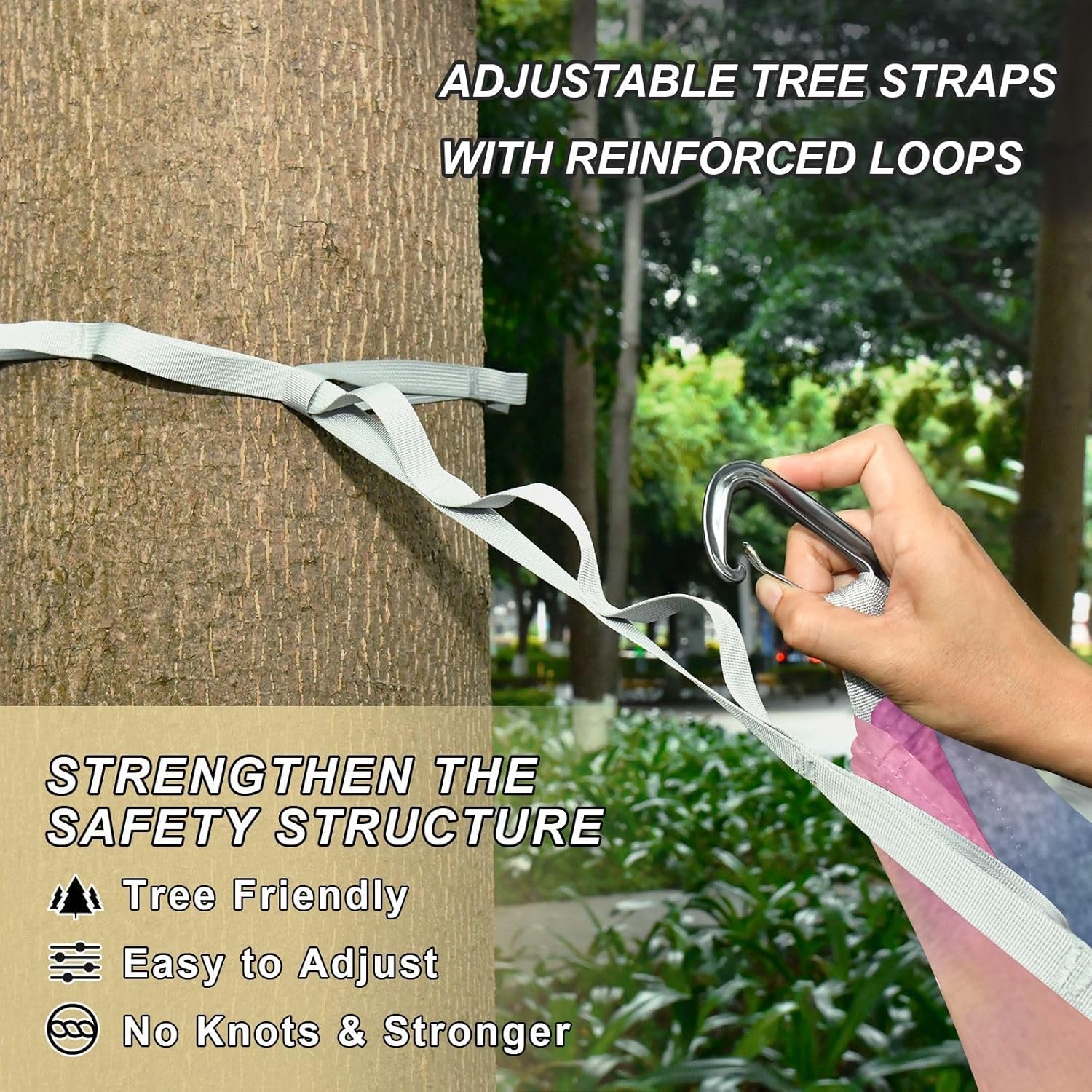 Spacious Size: This single Hanging Hammock measures 114in/290cm ×54.33in/138cm, providing ample space for users to rest comfortably. It can bear a load of 330LB/150KG.Material Description: Polyester. Swing Hammock fabric is made of high-strength and breathable 210T polyester taffeta, which has excellent wear resistance, tear resistance and breathability, ensuring comfort and safety. The climbing buckle is made of aluminum alloy, and the tree belt is made of high-density 600D imitation nylon webbing, which is sturdy with strong load-bearing capacity.Design: This edge of Swing Hammock is equipped with hanging pockets, which can be used to store personal items. Hammock is relatively light in overall weight. A single hammock usually weighs 490g and can be folded for storage. When folded, it is compact in size and easy to carry.Multi-scenario Applications: Seaside, Safari, back garden, indoor and outdoor, hiking or camping, etc. Rope Hammock can be given as a present to friends and relatives who love outdoor sports.Warm Reminder: When cleaning this Rope Hammock, remember to remove the climbing at both ends. If you have any questions, please contact our customer service by email and we will answer your doubts in a timely manner.