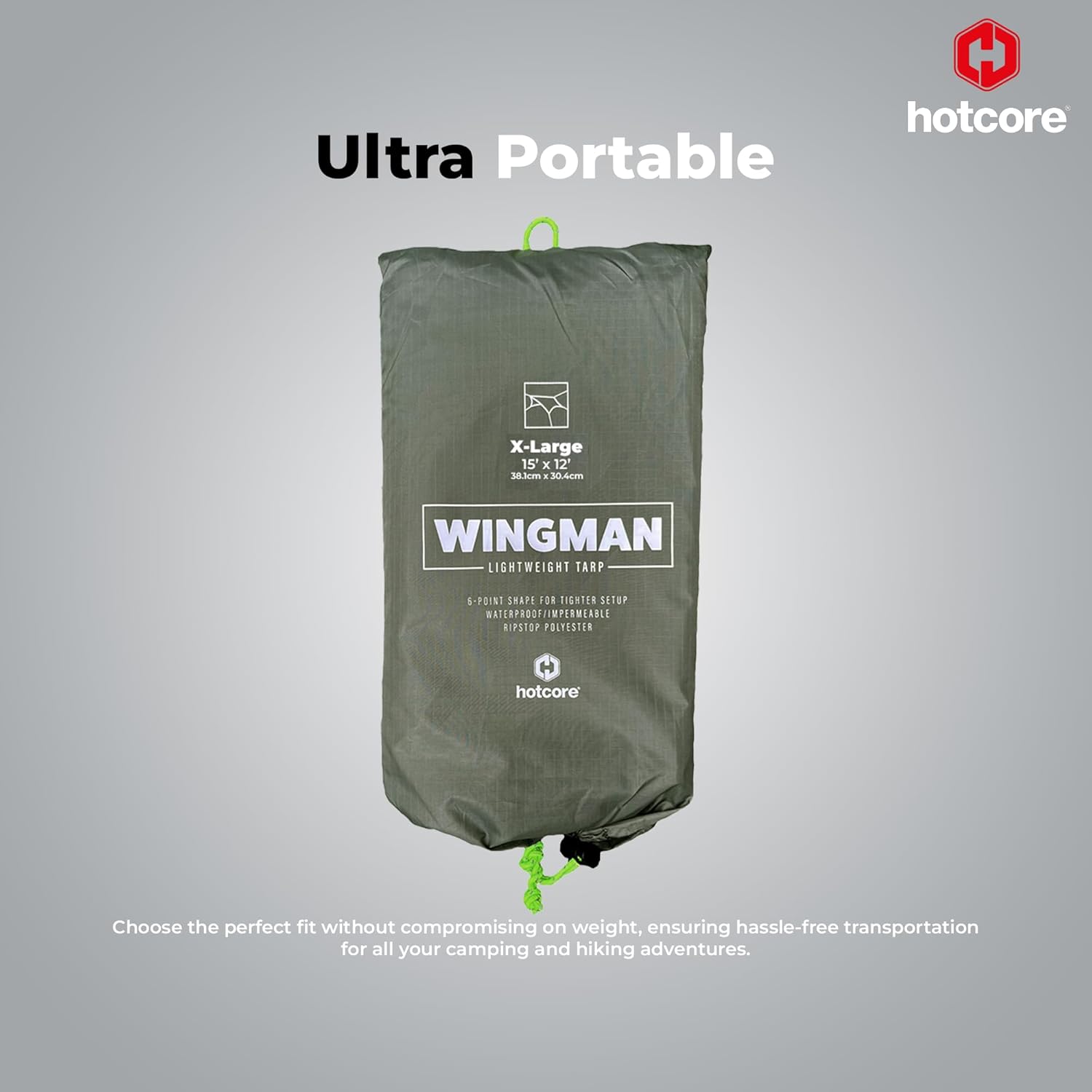 Introducing the Hotcore Lightweight Waterproof Tarp, your ultimate companion for camping, hiking, and outdoor adventures. Crafted with precision and durability in mind, this tarp is designed to elevate your camping experience. Constructed from robust 75D ripstop polyester in Seaweed Green and Yellow Lime, this tarp ensures strength and resilience against the elements. The 2000mm waterproof coating and taped seams provide a reliable barrier against rain, keeping you dry and comfortable in any weather. The extra UV protection coating enhances the tarp's longevity, making it a reliable choice for prolonged outdoor use. The innovative 6-point catenary cut allows for a tight setup in various configurations, providing flexibility in adapting to different terrains and environments. Reinforced corners and stitching add an extra layer of durability, ensuring that this tarp can withstand the rigors of your outdoor adventures. Equipped with 2 grommets on each side (Size Large), the tarp offers versatile setup options, accommodating extension poles or hiking poles (not included). The inclusion of reflective hi-visibility guylines enhances safety during low-light conditions, emphasizing Hotcore's commitment to your well-being. For those seeking an even larger coverage area, the XL tarp boasts 2 extra grommets on each side and is specifically designed for a center pole, with a convenient web loop on top for added functionality. Despite its impressive features, the Hotcore Lightweight Waterproof Tarp remains remarkably portable. With varying sizes to choose from, ranging from the Small at 420g to the Extra Large at 1.25kg, you can select the perfect fit for your needs without compromising on weight. If you're already a fan of Hotcore products, like the Wingman tarp, you can expect the same level of quality and reliability with this new addition. Embrace the outdoors with confidence, knowing that your camping gear is backed by Hotcore's dedication to excellence. Whether you're a seasoned backpacker or a casual camper, the Hotcore Lightweight Waterproof Tarp is your go-to choice for a seamless outdoor experience.