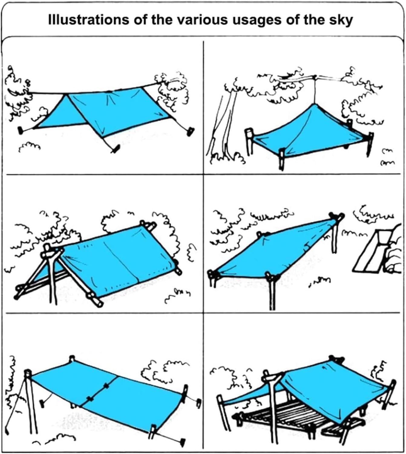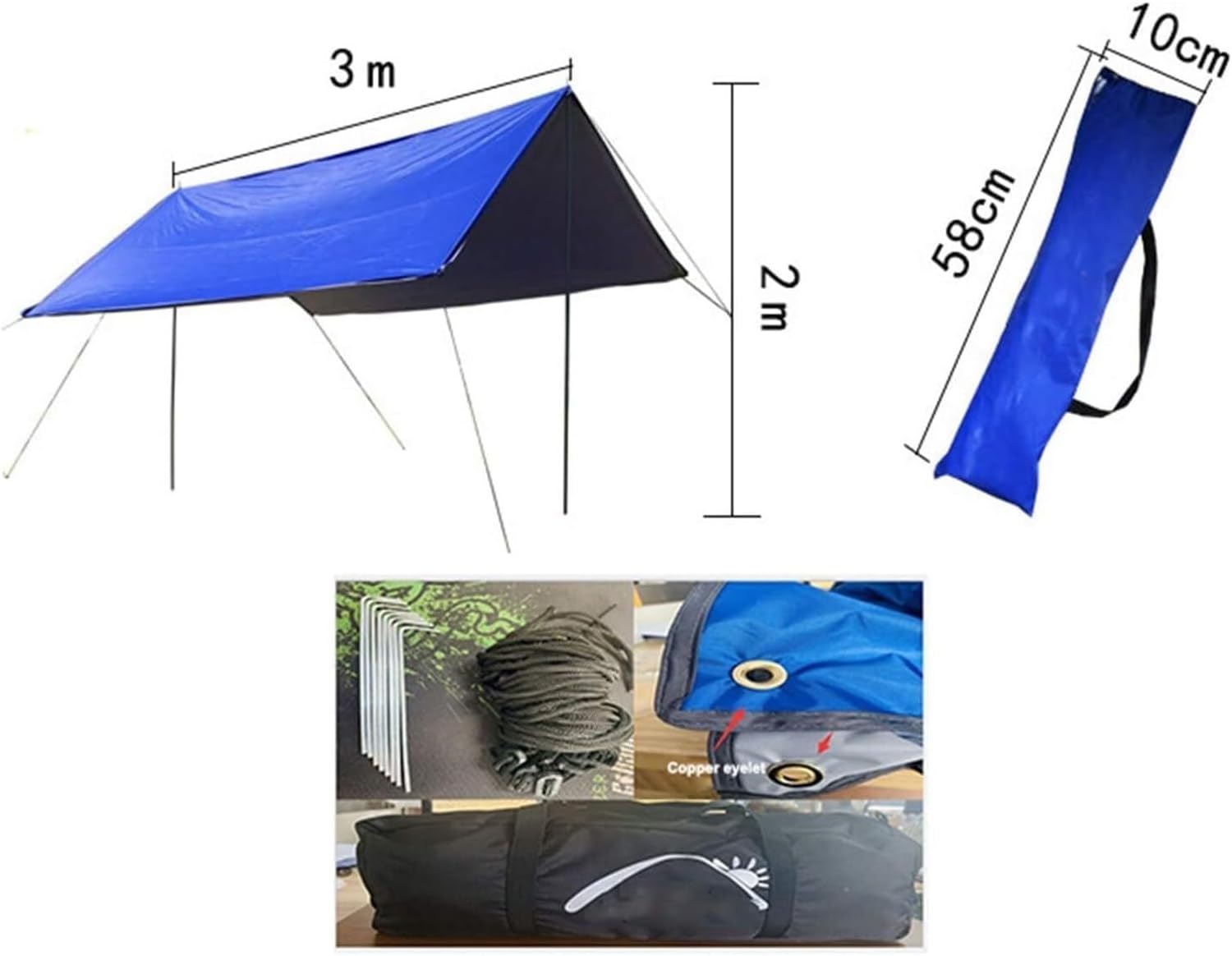 Enjoy your Outdoor Camping with no Worry!Are you sick of being wet during your camping?Or backpacking and caught in the rain and you need a cover?Or maybe you just need a shade while on beaches?Get Our Camping Tent Tarp Shelter Mat Hammock Cover for Your Outdoor Activities!Features: large space, stable structure, good ventilation performance, wide range of applications, outdoor camping, can be used as a command room! When not in use, it can be folded in the hand bag attached to the tent, which is small in size, easy to carry and slung.Material: 190T anti-ultraviolet silver-coated polyester clothColor: sapphire blueProduct Specifications:300 (Length) *300 (Width) *200 (Height) cm (5-10cm Error)Product Weight: About 1.6kgPackage Includes:1 x Large Tarpaulin1 x Handy Carry Bag2 × support rod (8 sections in total)8 x Aluminium Nail8 x Wind ropeNote:Due to Manual Measurement, Please Allow Slightly Different SizesDue to the Difference in Light and Screen, the Color of the Project May Be Slightly Different from the Picture Thank You for Your UnderstandingIf You Have Any Questions, Please Feel Free to Contact Us!
