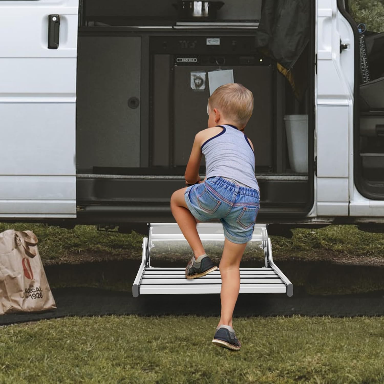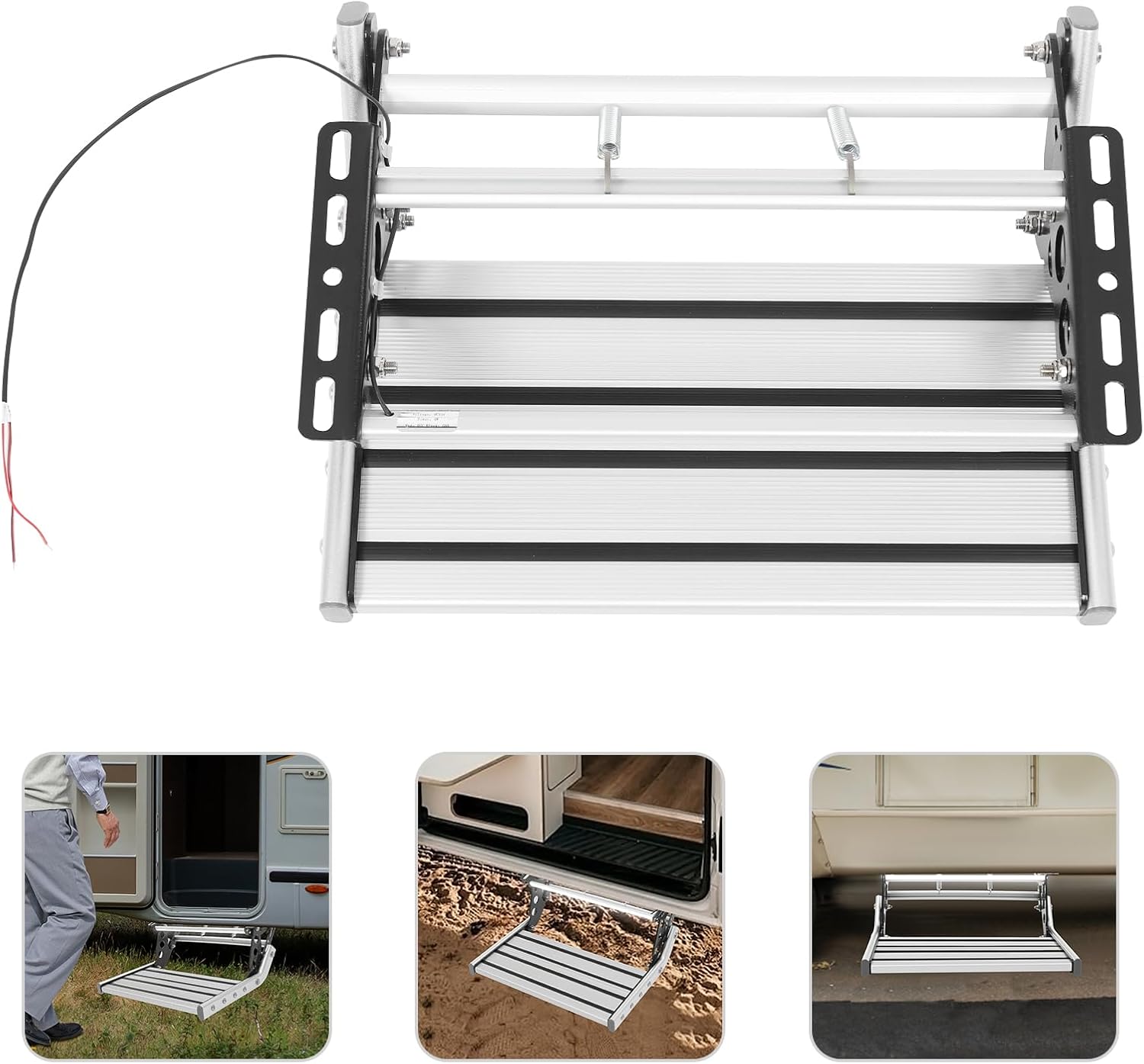 DescriptionThis aluminum alloy single-tier folding RV step is specially designed for your RV life. It combines elegant design and practical function and comes with an LED light bar, improving your safety of getting on and off the car at night. The lightweight and sturdy aluminum alloy and non-slip rubber strip design ensure the durability of the product and effectively prevent you from slipping, making your every trip safe and convenient.DetailsStrong Spring: Reinforced stainless steel springs have a longer service life while making it more labor-saving to unfold and fold the product.Non-slip Pedal: It is designed with aluminum alloy and rubber anti-slip strips interlaced, which can effectively prevent slipping on rainy days and make getting in and out of the car safer.ApplicationThe product is suitable for use in motorhomes, campers, caravans, and other vehicles of the right size.SpecificationsColor: SilverInstallation Required: YesMaterial: Aluminum AlloyProcess: AnodizeLight Source: LEDLight Color: YellowishLighting Voltage: 12VLoad Bearing Capacity: 150kg/330.69lbsStep Board Length: 44cm/17.32inMounting Part Dimension: 48.4*20cm/19.05*7.87inProduct Overall Size: 47.6*50.1*18.3cm/18.74*19.72*7.2inPackage Size: 51*42*15cm/20*16.54*5.91inGross Weight: 5.1kg/11.24lbsNet Weight: 4.5kg/9.92inPackage Included1* Folding RV Step1* English Diagram4* Bolts