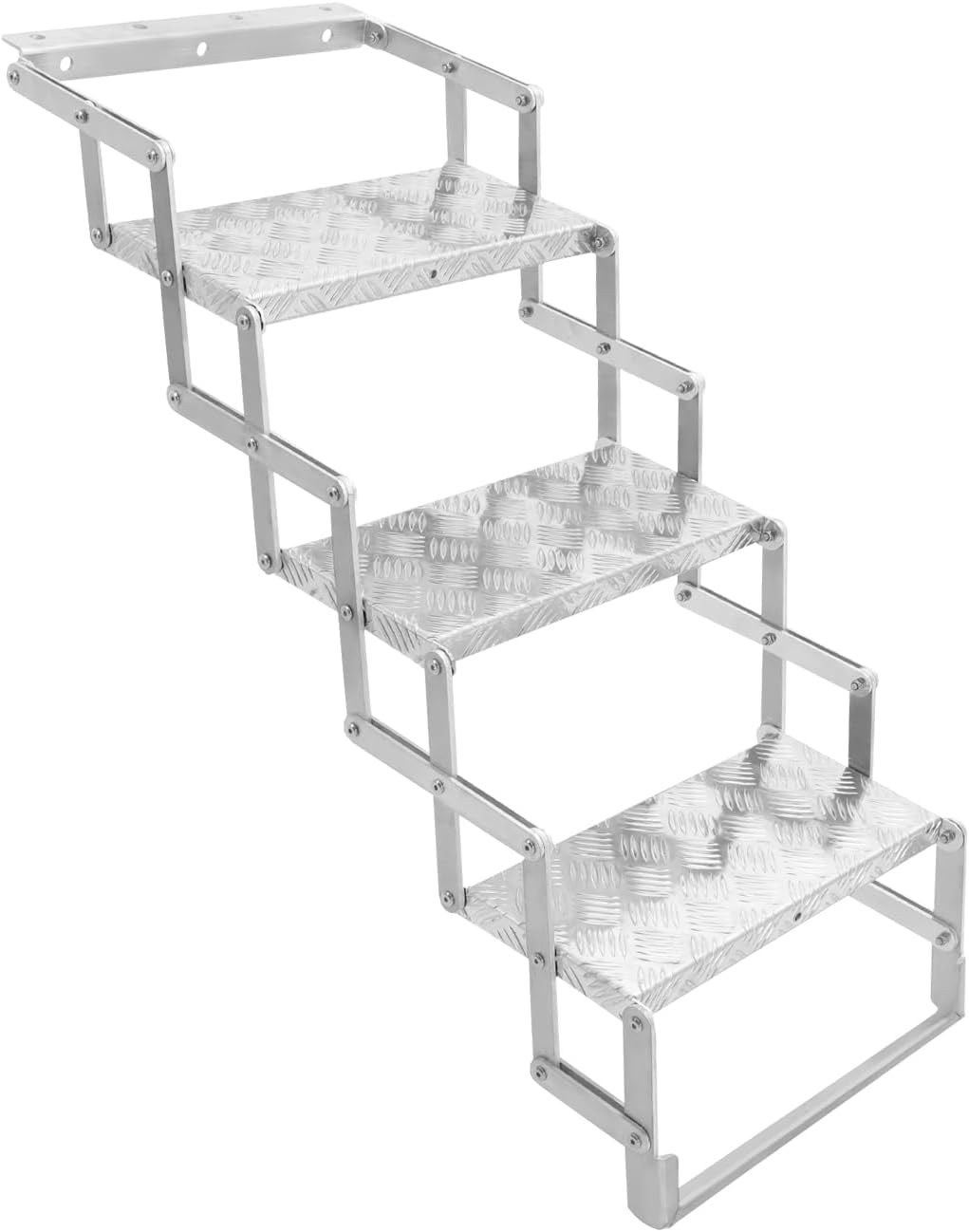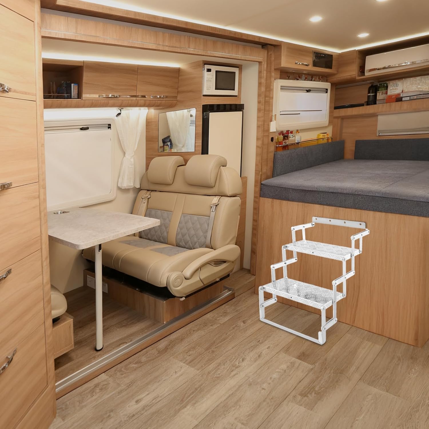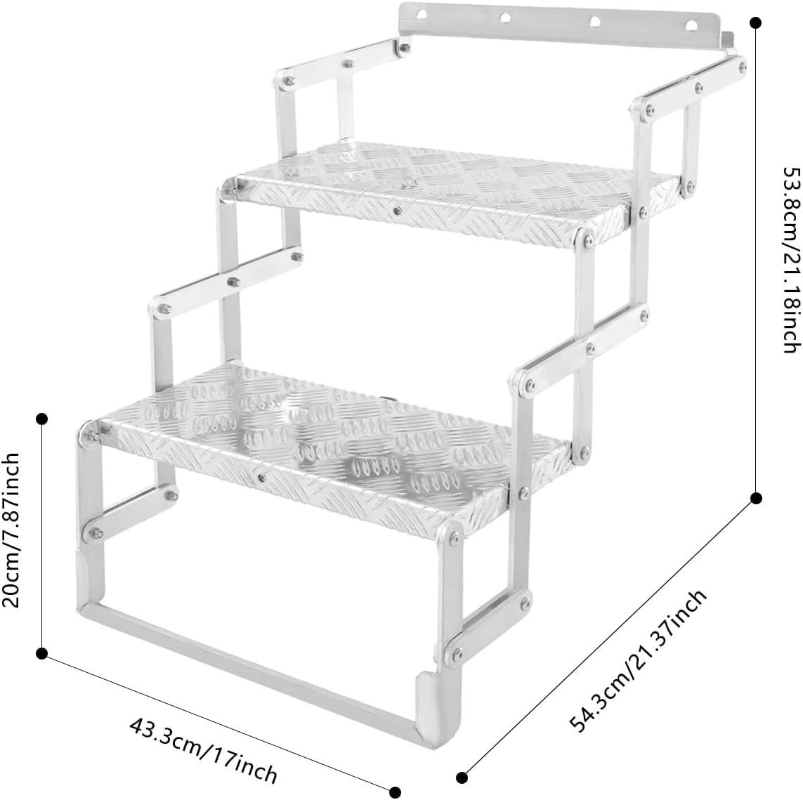 DescriptionSleek, sturdy, and long-lasting—it is crafted from premium materials with a high weight capacity for reassuring use. Textured steps ensure secure footing, while the minimalist design blends style with function, fitting naturally into your vehicle. Foldable and space-saving, it’s the ideal companion for every RV adventure.DetailsMounting Holes: Located on the top bracket, they facilitate quick installation.Secure Buckle: It keeps the folded product locked tight, ensuring compact and reassuring storage.ApplicationIt is suitable for RVs, travel trailers, truck campers, attics, warehouses, supermarkets, libraries, etc.SpecificationsMaterial: Aluminum Alloy, Carbon SteelProcess: OxidationColor: SilverNumber of Steps: 2Total Load-bearing Capacity: 110kg/242.5 lbsDistance Between First Step and Floor: 20cm/7.87inchUnfolded Product Size: 54.3*43.3*53.8cm/21.37*17*21.18inchPackage Size: 47*27*20cm/18.5*10.63*7.87inchGross Weight: 4kg/8.82 lbsNet Weight: 3.5kg/7.72 lbsPackage Included1* Foldable Step Ladder1* Hex Wrench