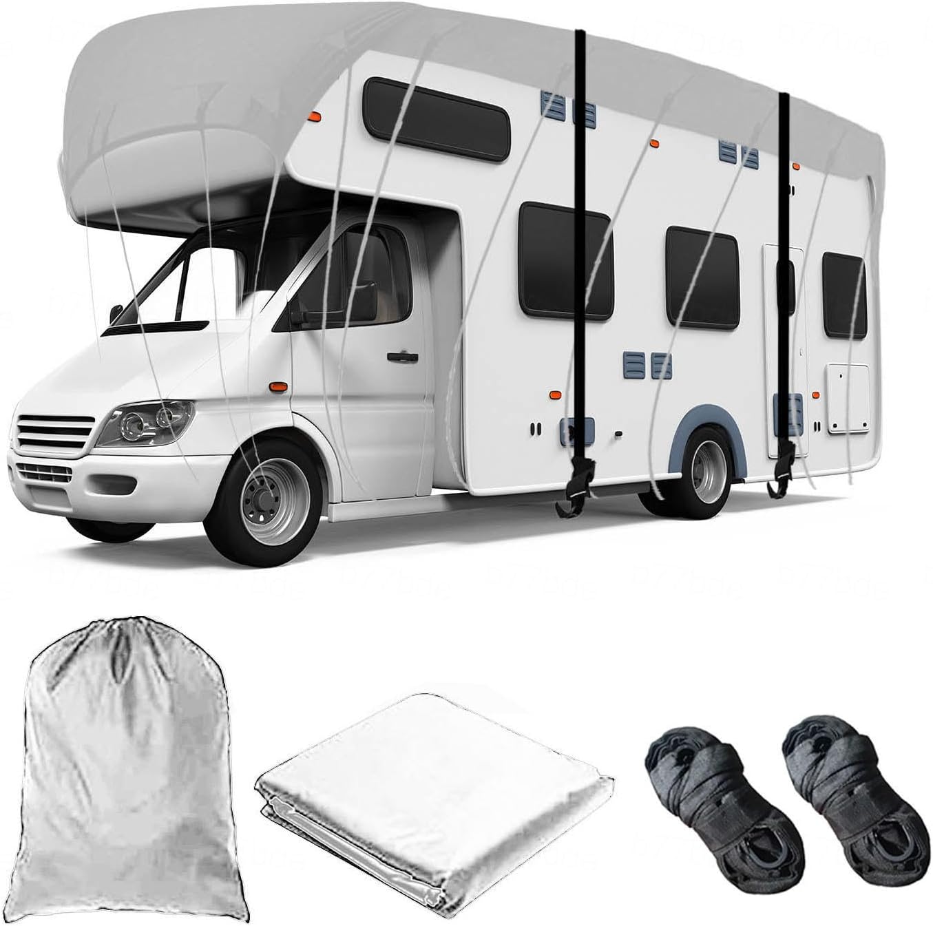 Helps extend the life of your RVIt’s essential to shelter your RV from the elements, especially while it’s not in use. RV covers help extend the life of your RV, while reducing the need to wash, wax and do roof treatments. These covers are not only extremely durable, they also help protect against the elements.These covers also ward off dirt, pollen, etc. from building up and leaving black streaks.This cover can also fit over RV accessories such as satellites, horns, air conditioners, and more. This cover is a quick and easy solution to keep the roof of your RV clean and protected!Product Information:Features:Suitable for all seasons, UV protection, heat dissipation, snow and frost protection, and sun protection.Dimensions: 7 x 3.3 m / 23 x 10.8 ft; 8 x 3.3 m / 26.2 x 10.8 ft; 9 x 3.3 m / 29.5 x 10.8 ft; 10 x 3.3 m / 32.8 x 10.8 ft; 11 x 3.3 m / 36 x 10.8 ft; 12 x 3.3 m / 39.9 x 10.8 ft .3 x 10.8 ft; 13 x 3.3 m / 42.6 x 10.8 ft; 14 x 3.3 m / 45.9 x 10.8 ft; 15 x 3.3 m / 49.2 x 10.8 ftMaterial: 210D Oxford ClothColor: Black, GrayOperation: ManualPacking Included:RV Cover * 1Reinforced Straps * 2 (10 m / 393.70 in / each)Packing Bag * 1Note:Parts Inspection: To prevent strap tangling, straps and hooks are separated. Verify the parts list before assembly to ensure all components are complete and undamaged.Easy Installation: The RV cover requires manual adjustment to achieve a perfect fit. Experience parts transforming like magic in your hands.