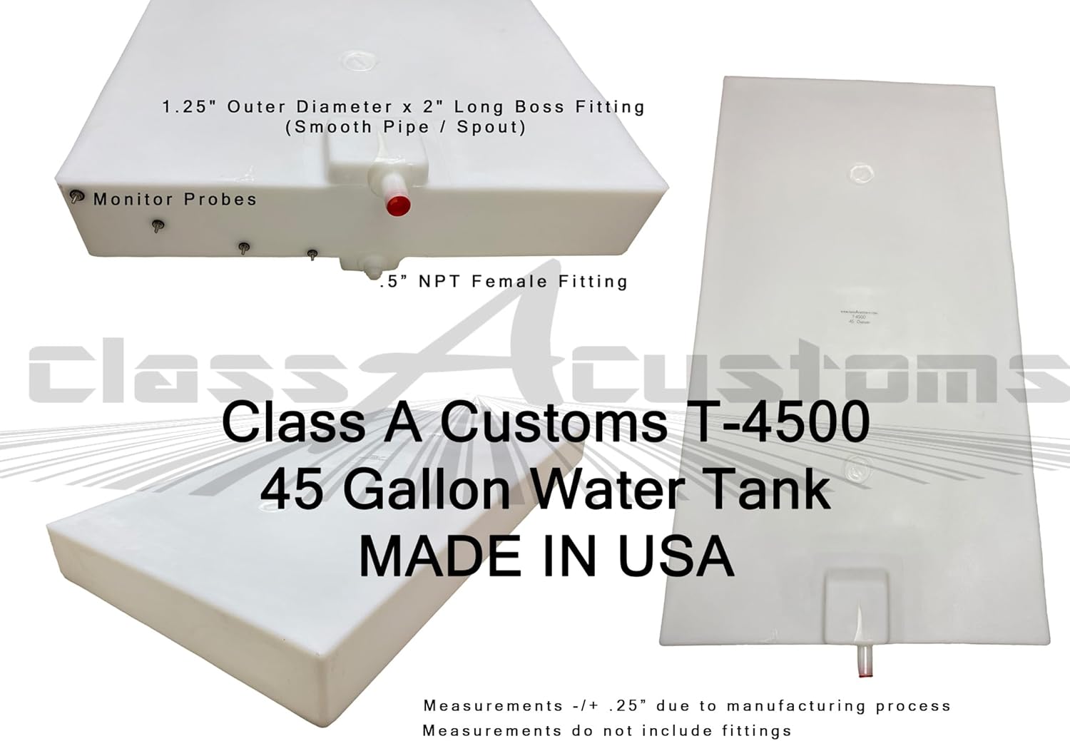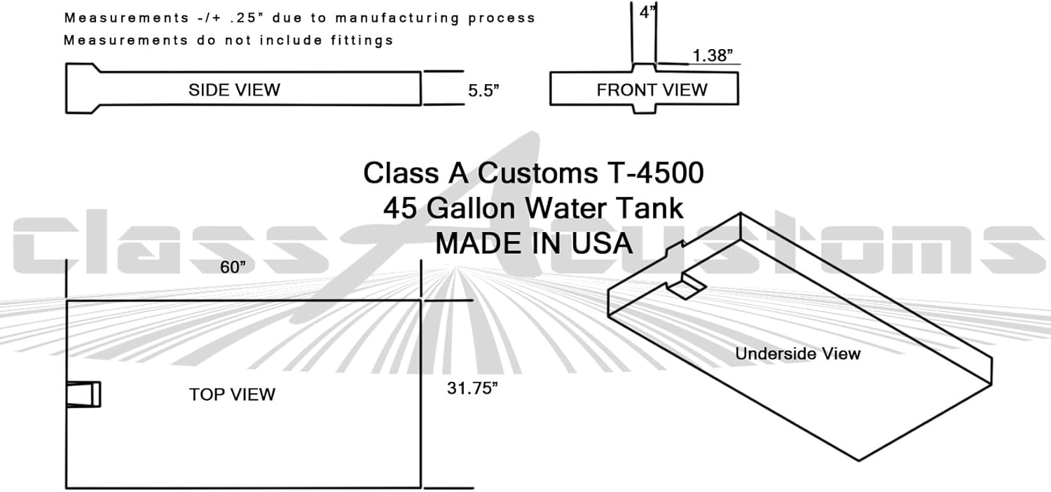 FRESH/DRINKING WATER SAFE – MADE IN THE USA by Class A Customs using NSF Certified Materials Tank & fittings made from DOW NSF International NSF/ANSI Std 61 approved Medium Density Polyethylene (MDPE) Resin SEAMLESS One-piece construction, no seams to burst COLOR Creamy White you can see waterline through tank. OEM PART No retail box - no install instructions Have a certified technician install all parts to prevent product damage and personal injury PREPARATION Tanks are made in a warehouse clean each tank prior to use to remove any debris, scuffs or marking from the manufacturing process. TANK MUST BE VENTED allowing air in and out when in use. *DO NOT PRESSURIZE TANK* do not make a sealed connection from garden hose directly to tank damage will occur. DO NOT over-tighten fittings damage will occur. MOUNTING & BRACING Place tank on level surface and brace to prevent tank from moving during transit. DO NOT hang tank by straps. DO NOT place weight on tank. FOOD VENDORS - BEFORE PURCHASING - Verify all requirements with health department where inspection will be made.