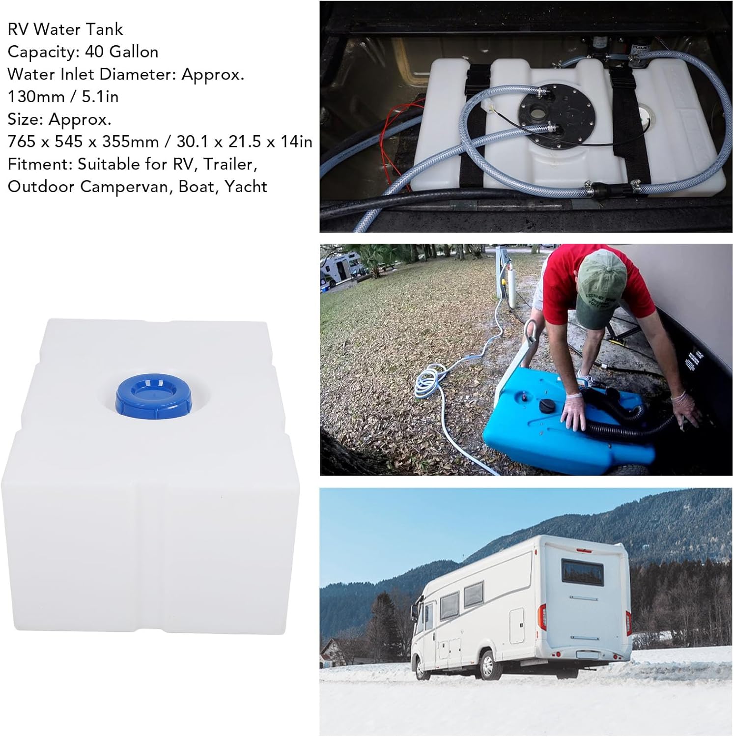 Spec: Item Type: RV Water Tank Material: Food Grade LLDPE Capacity: 40 Gallon / 80L Size: Approx. 765 x 545 x 355mm / 30.1 x 21.5 x 14in Features: Seamless one piece design, smoother interior and exterior, hollow Application: Vehicle water storage, liquid storage, soilless cultivation box, etc Fitment: Widely used in multiple scenarios, such as RV, trailer, campervan, boat, yacht, packing list: 1 x Water Tank