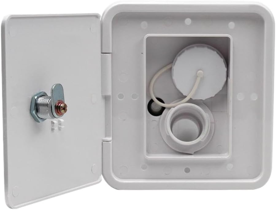This white gravity-fed water tank inlet is constructed from ABS plastic with reinforcement for outdoor use.It features a locking door mechanism and includes two for secure access.The inlet is equipped with a 1-1/4 inch barb connection and a 1/2 inch air vent to support efficient filling.Installation hardware includes one screw and putty.Note: Threaded connection components are not included.Package contains one water inlet and two.