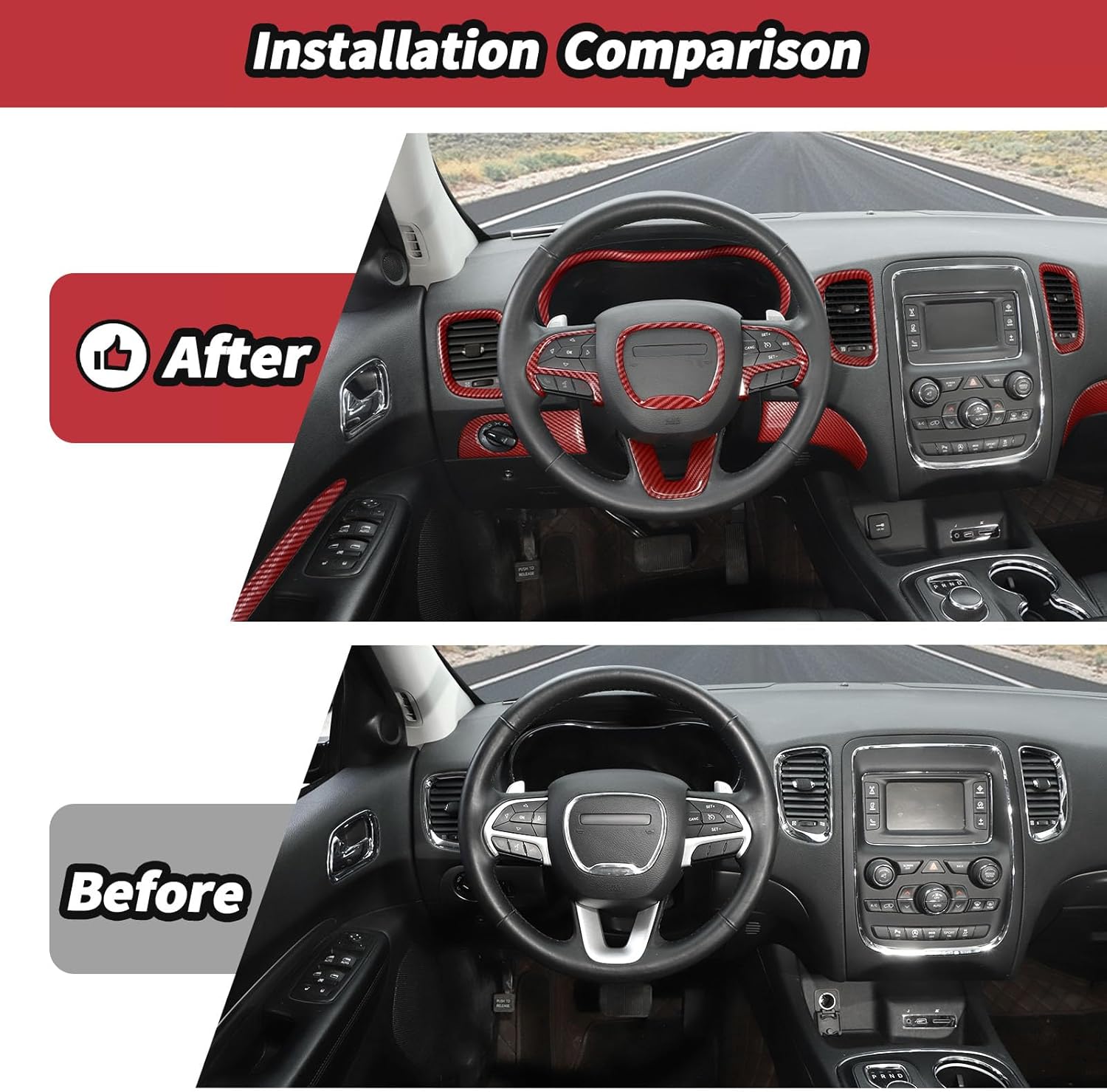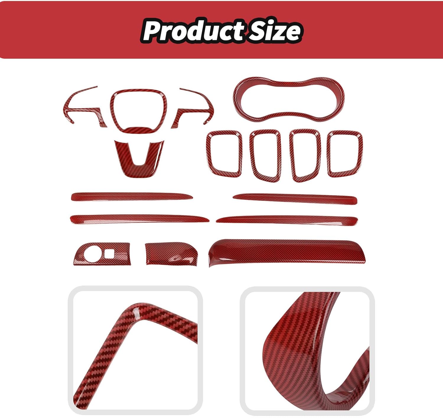 Description: JeCar 16pcs Red Carbon Fiber Interior Trim Accessories Kit for 2014-2020 Dodge Durango - Dashboard, Inner Door Panel Decoration Upgrade Set These interior panel decoration cover kits are precisely engineered to fit for 2014-2020 Dodge Durango models. Designed exclusively for the key interior areas including the dashboard trim panel, driver control area surround, and door interior panel trims, these covers upgrade your Durango interior style instantly with a realistic red carbon fiber texture. 【Premium ABS – Durable & Stylish】 Crafted from high-quality ABS, these interior trim covers provide excellent durability, scratch resistance, and long-lasting color retention. 【Enhance Interior Appearance】 The red carbon fiber design adds a unique pop of color. That complements Durango styling. Perfect for interior customization lovers, this trim elevates cabin aesthetics and creates a more personalized, high-end look—ideal for Durango interior decoration, dash, and door panel upgrades. 【Quick & Easy Installation – Non-Destructive Upgrade】 Installation takes minutes. Comes with automotive-grade adhesive tape for a secure and stable hold. Simply clean the surface, peel, and stick—no tools, no drilling, and no damage to your original parts. 【Full Protection for Interior Accessories】 The covers help protect your factory accessories from scratches, wear, fading, and smudges—especially useful for daily use. Maintain a clean and stylish interior for years. Upgrade your Durango’s cabin with this red carbon fiber interior dashboard, door panel cover trim kit. Whether you're customizing your Durango interior style, refreshing worn interior parts, or adding an elegance, this trim offers a perfect blend of durability, functionality, and style. For Durango owners seeking interior style upgrades and protection, quick installation makes this an easy DIY upgrade for Durango enthusiast.
