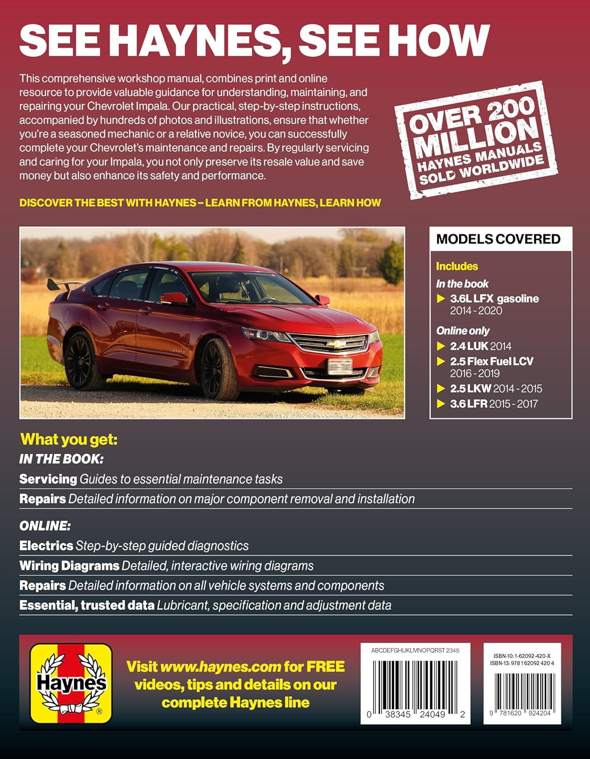 Maximize your maintenance confidence with the Haynes Repair Manual for the Chevrolet Impala (2014–2020). Designed for hands-on vehicle owners and DIYers of all levels, this manual delivers expert-backed procedures for in-book coverage of the 3.6L LFX V6 gasoline engine and includes additional online coverage for the 2.4L LUK (2014), 2.5L LKW (2014–2015), 2.5L Flex Fuel LCV (2016–2019), and 3.6L LFR (2015–2017) engines. Loaded with step-by-step instructions, maintenance schedules, and color photographs, this guide helps you tackle everything from oil changes and brake jobs to complex engine diagnostics. Exclusive QR codes grant access to online-only repair procedures and limited wiring diagrams—making essential digital content available from your phone, tablet, or computer. With over 60 years of trusted service to automotive enthusiasts, Haynes Manuals are the gold standard for affordable car care. Whether you're troubleshooting a misfire, preparing for a road trip, or just learning more about your Impala, this manual puts dealership-level knowledge in your garage.