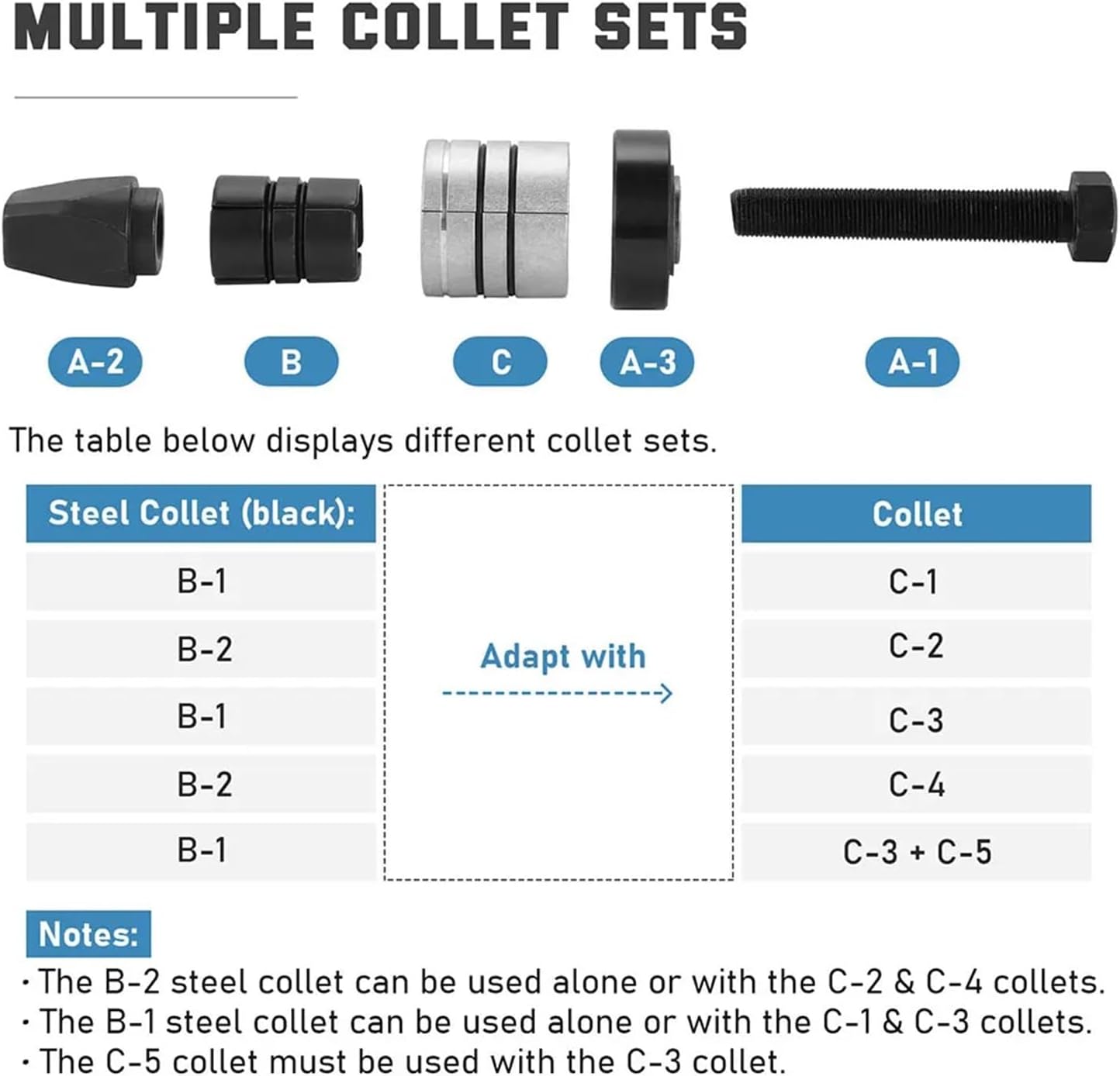 AUTO PIPE EXPANSION KIT This mechanic's tool kit provides the handy collets and expander required to stretch tailpipes before making tight seals to pipes with smaller diameters. for home DIY or professional auto shops.WIDE EXPANDING RANGE: The exhaust pipe stretcher offers various collets for a broad expansion range from 1-5/8" to 4-1/4". Includes: Steel expander 1 5/8" - 2" Collet, Steel expander 2" - 2 1/2" Collet, 2 3/8"- 2 3/4" Collet, 2 3/4" - 3 1/8" Collet, 3 1/8" - 3 1/2" Collet, 3 1/2" - 3 7/8" Collet, 3 7/8" - 4 1/4" Collet.EASY OPERATION: Choose the proper collet, clamp the pipe, and then expand the pipe-operation of our stretcher kit is really that simple! Use a 1/2" or 3/4" impact wrench to save even more effort. Our helpful user manual is included to guide you through the process.HEAVY-DUTY CONSTRUCTION: All collets are made of aerospace-grade 6061 Aluminum while the expander utilizes Tempered 40CR Alloy Structural Steel, ensuring rugged rigidity over an extended service life. EXTRA PROTECTION: for fitting aftermarket exhaust components to standard tailpipes. Includes a convenient tool storage case and one pair of protective gloves to ensure your safety throughout the