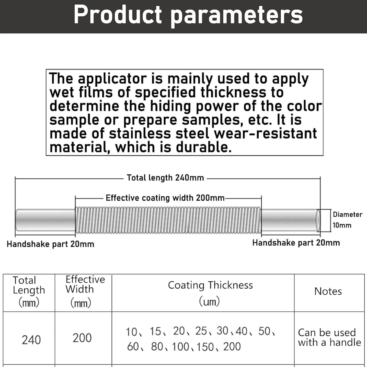 Specifications: Name: Wire Bar Wet Film Applicator Material: Stainless Steel Function: Wire Bar Coating Thickness: 10μm, 15μm, 20μm, 25μm, 30μm, 40μm, 50μm, 60μm, 80μm, 100μm, 150μm, 200μm, Coating Width: 200 mm Total Length: 240 mm Products include: 1 * Wire Bar Wet Film Applicator