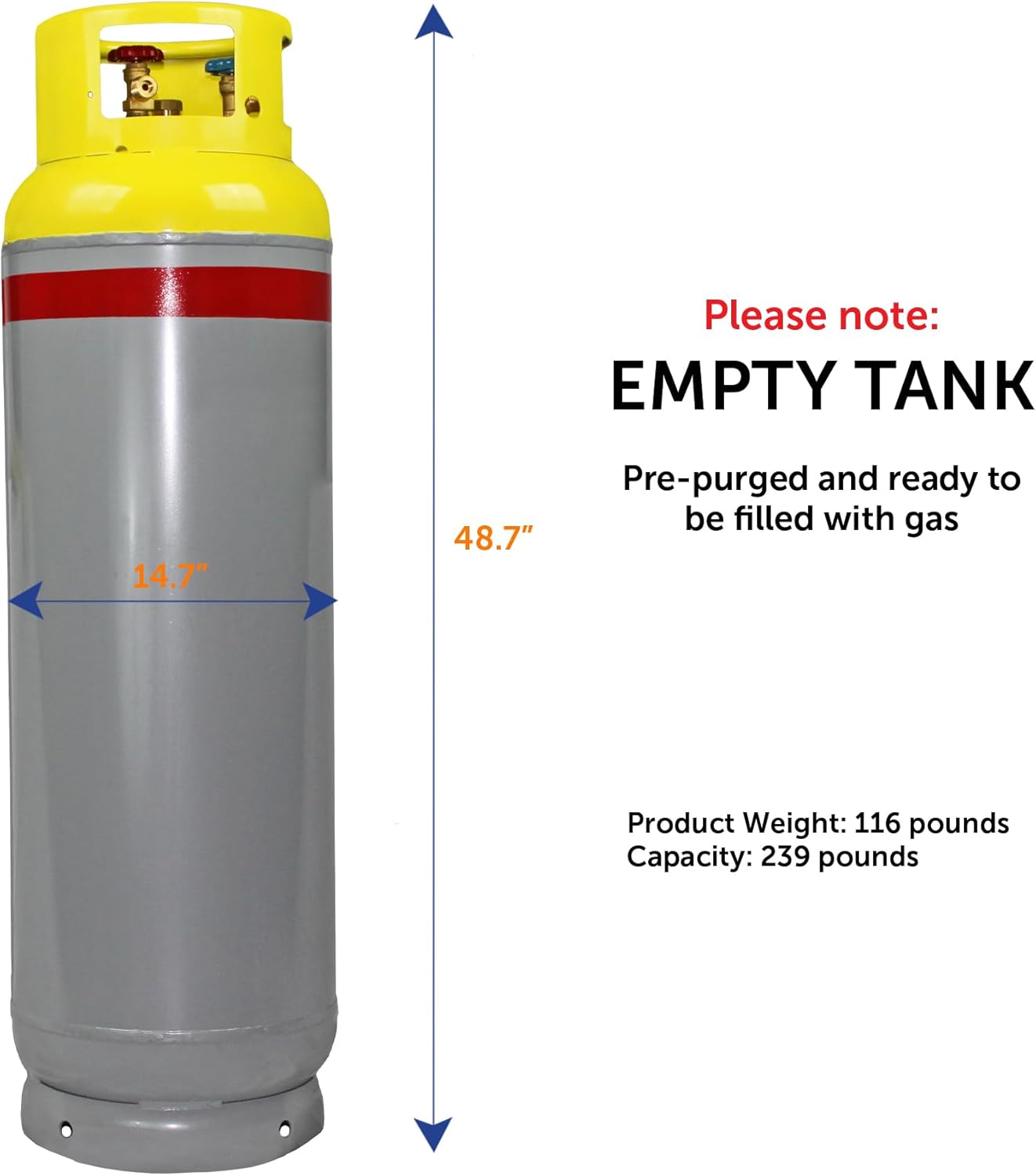This 239LB Refrigerant Recovery Cylinder is built to industry standards, manufactured in ISO 9001-certified facilities, and compliant with DOT-4BA-400 specifications and AHRI guidelines. It is DOT and TC certified for safe and reliable use. Designed for use to recover, store, and transport A2L refrigerants, which are mildly flammable and used in a wide variety of refrigeration and air conditioning applications. Equipped with reverse (left-hand) threads and a built-in pressure relief valve, both of which are critical safety features. Constructed from high-grade welded steel and finished with a corrosion-resistant powder coating, this refillable tank offers heavy-duty durability. Each unit is X-rayed and hydrostatically tested, pre-purged, and vacuum-ready for refrigerant filling. Designed with two high-quality valves for easy access to liquid and vapor. The pressure relief valve ensures safe venting in case of overpressure, helping to prevent tank rupture or uncontrolled gas release. Also available in 30LB, 50LB, and 239LB sizes - Models YSN301R-A2L, YSN501R-A2L, YSNR123-A2L-YE.