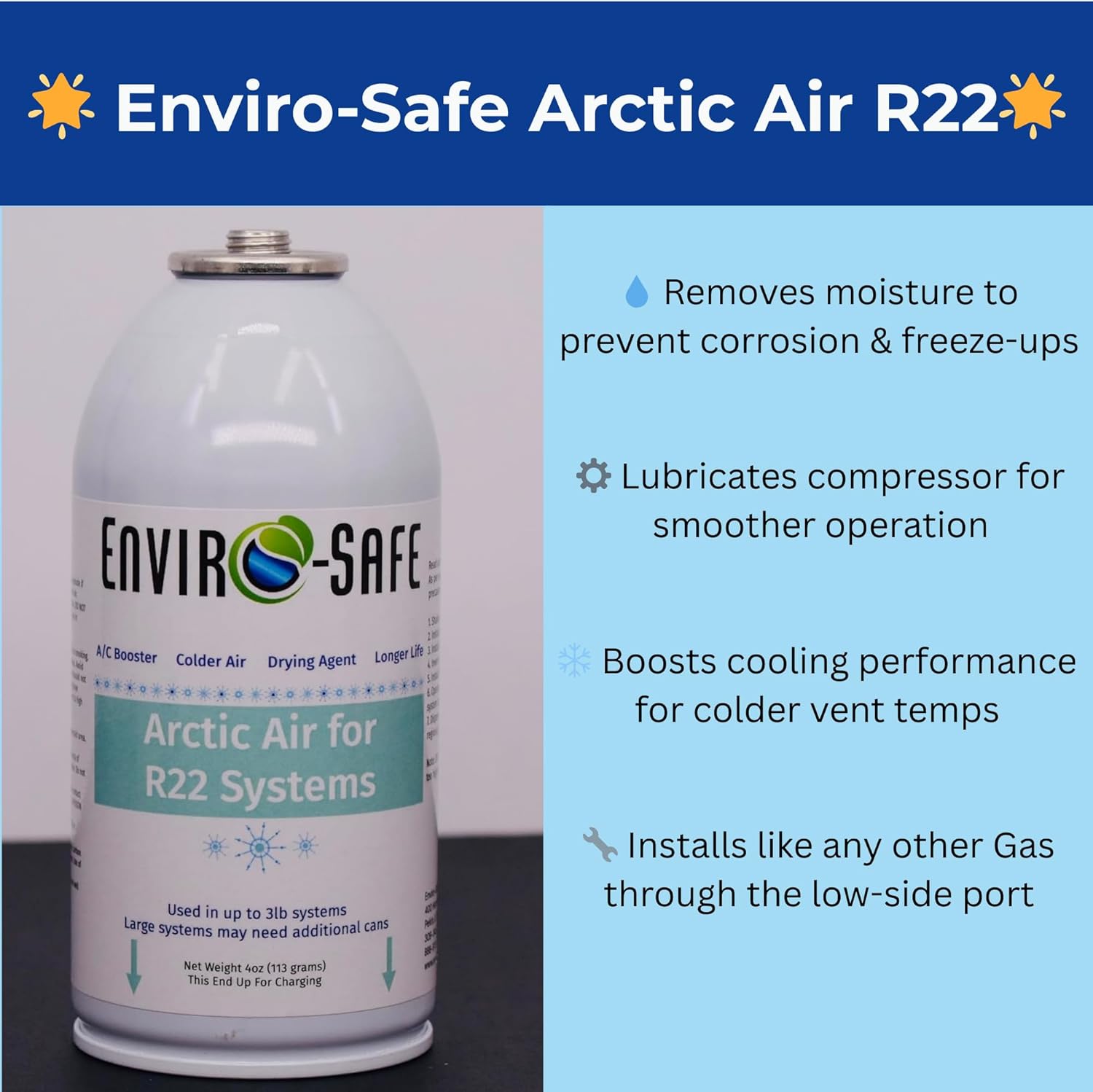 Bring new life to your R-22 cooling system with Arctic Air, the proven AC system booster and drying agent that goes beyond ordinary solutions. Specially formulated for R-22 units, this product is designed to help restore performance, fight moisture, and keep your system running smoother, longer. Each 4 oz can is packed with benefits: Improves Cooling Efficiency – Customers often experience colder vent temperatures after treatment, helping their system feel more powerful. Fights Moisture Damage – Moisture inside an AC system can cause corrosion, internal wear, and ice build-up. Arctic Air actively removes excess moisture to protect your components. Reduces Friction – Promotes smoother system operation, helping compressors and moving parts run more efficiently. Extends Equipment Life – By cleaning and protecting from the inside out, Arctic Air can help your R-22 system stay reliable for years to come. Easy to Use – Each can connects with standard tools, installs in minutes, and works directly through the low-pressure side of the system. Whether you’re maintaining your home unit or servicing multiple systems, Arctic Air is the smart solution to keep your cooling running strong.