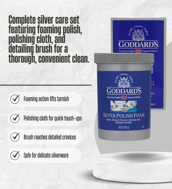 Goddard's Mild Scent Silver Polish Foam offers a practical solution for maintaining the appearance of silver items. Formulated as a rich foam, it penetrates intricate designs and fine filigree to dissolve tarnish and reveal the natural luster of silver surfaces. The polish is easily applied with a sponge or brush and rinses away cleanly with water, making it suitable for items that can be safely immersed. The mild scent ensures a more comfortable user experience during cleaning. In addition to removing tarnish, the foam leaves behind a tarnish-resistant barrier designed to help reduce future oxidation. This protective layer supports ongoing care by helping to keep silver surfaces looking brighter between routine cleanings. Suitable for use on silverware, jewelry, and decorative pieces, it provides an efficient option for regular silver maintenance. This gift set includes a 2x 18 oz container of Goddard's Mild Scent Silver Polish Foam, bundled with 1x soft wipes cloth + 1x detail brush. The cloth is ideal for quick cleanups and surface buffing, while the detail brush reaches into small crevices and ornate patterns. The three-piece set offers the essentials for basic silver care in a convenient package. All items are thoughtfully bundled for ease of use.