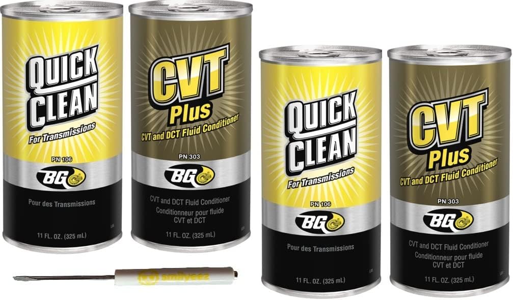 BG K6610 CVT DCT Transmission Quick Clean Flush PN106 & CVT DCT Plus Fluid Conditioner PN 303 KitBG Quick Clean for Transmissions quickly and effectively removes damaging deposits and cleans the valve body, filter screen and other important automatic transmission components, keeping transmissions operating efficiently.The automatic transmission contains more moving parts than any other system in a vehicle. After 30,000 miles (50,000 km), automatic transmission fluid breaks down. Deposits form on and around all of those moving parts. Slowly and without notice, those actuating parts begin sticking and gum up, causing gears to slip or chatter and making shifting difficult.BG Quick Clean for Transmissions dissolves and removes deposits from the valve body, the filter screen and many other critical transmission components.BG CVT Plus CVT and DCT Fluid Conditioner PN 303BG CVT Plus CVT and DCT Fluid Conditioner is designed for use in new and used fluid in belt- and chain-driven continuously variable transmissions (CVT), wet dual clutch transmissions (DCT) and direct-shift gearboxes (DSG).CVTs experience continuous high speed operation causing severe wear and extreme pressure conditions. CVT fluid experiences thermal and oxidative stress, which promote fluid degradation. CVTs can experience premature failure when levels of anti-wear chemistry become depleted. Metal particles and carbon deposits can greatly accelerate wear to the transmission components.When installed with BG Universal Synthetic CVT Fluid, BG CVT Plus will prolong fluid life, prevent deposit formation and improve fluid stability. As part of the BG Transmission Service, it is specially formulated to boost the performance of CVT fluid by keeping seals soft and pliable, boost anti-wear characteristics, and ensure smooth shifting.Includes a Smilyeez pocket screwdriver for opening the cans.
